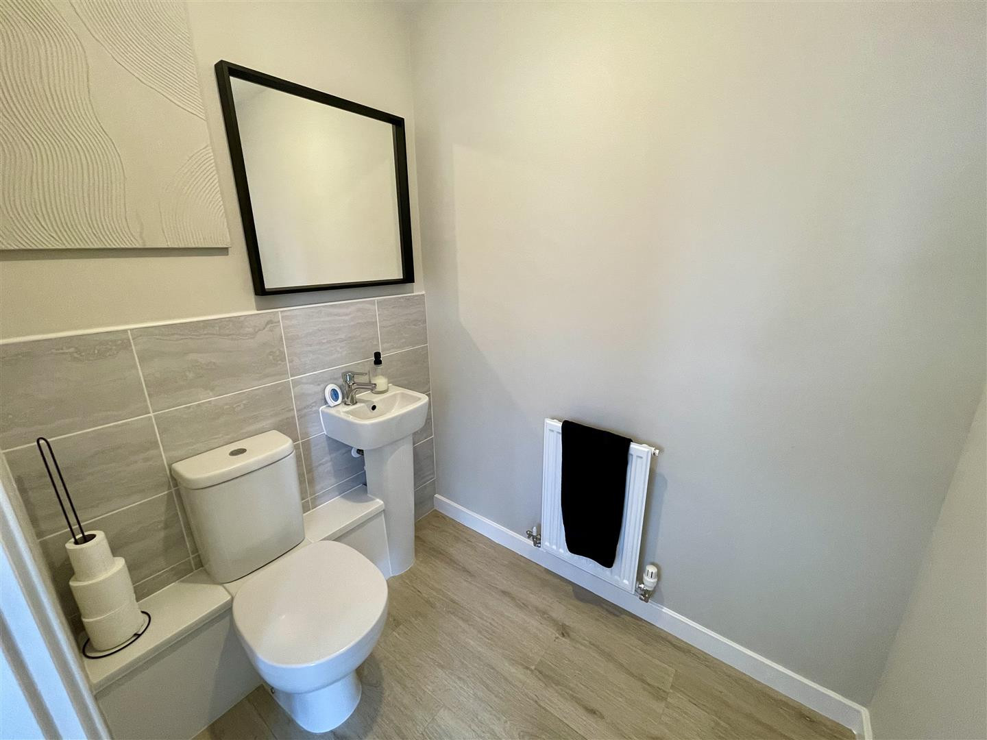 W.c, wash hand basin and heated towel rail. Part tiled walls.