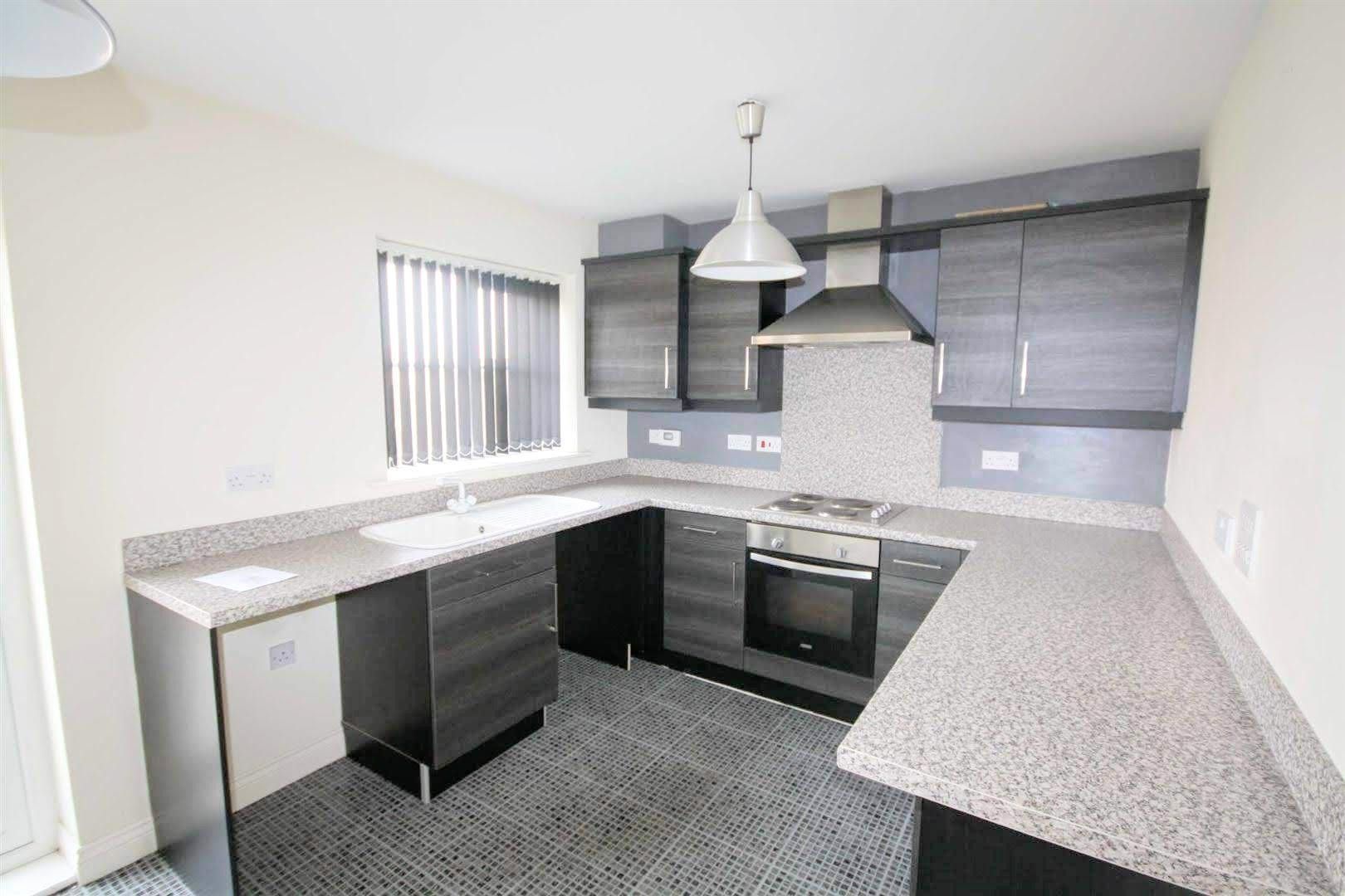 Fitted Grey wall/base units, ample worktops, sink unit and drainer, mixer tap, tiled splashbacks, built in electric hob/oven/extractor, UPVC double glazed window/french doors to garden.