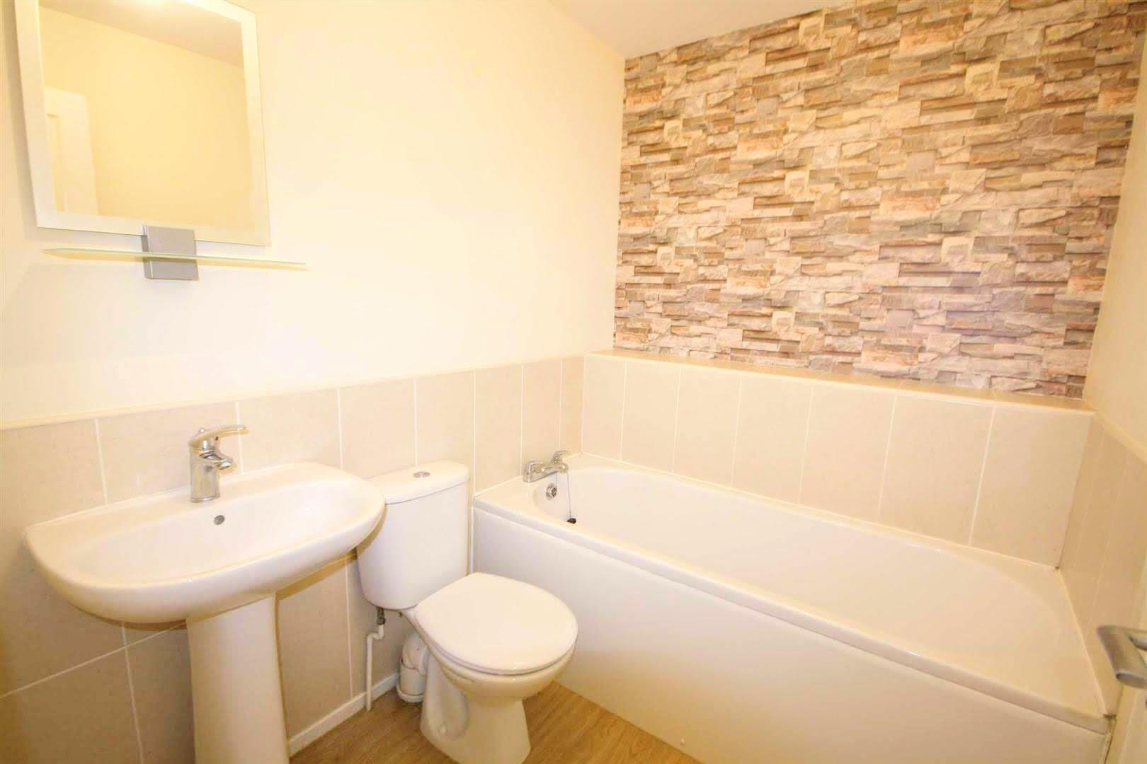 With white suite comprising of panelled bath, pedestal wash hand basin, low level wc, tiled splashbacks, radiator, extractor.