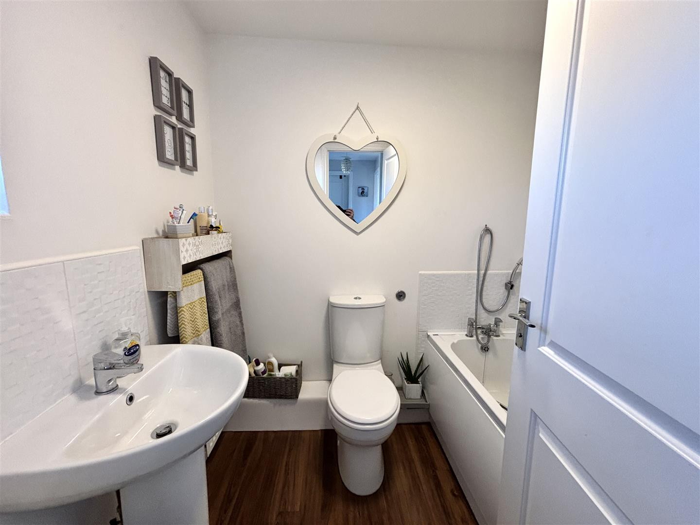 Fitted wirh a modern white suite comprising of a panelled bath with mixer shower, hand wash basin and WC. Having tiled splashbacks, radiator, an extractor fan and UPVC double glazed opaque window to the rear.