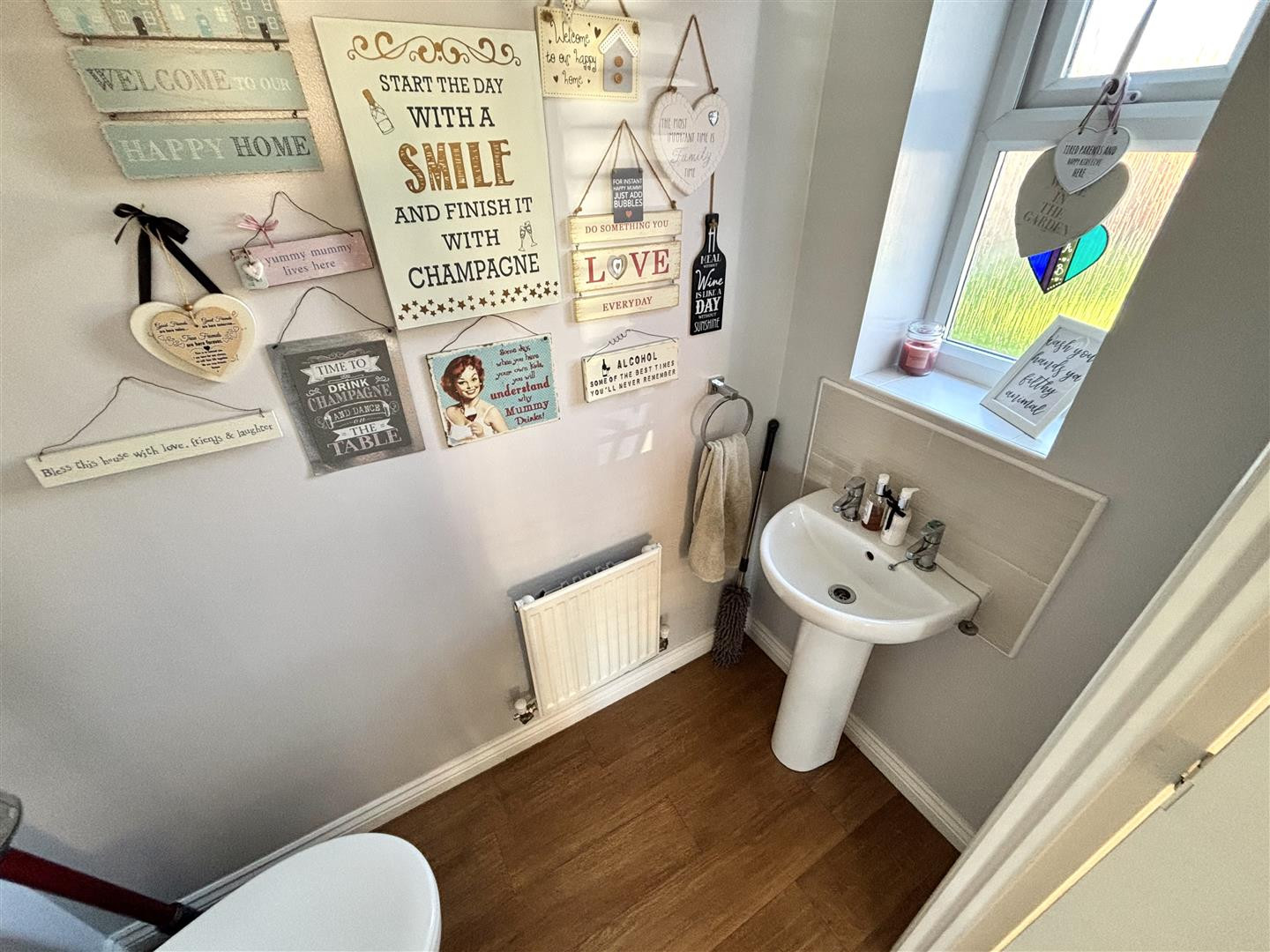 Comprising of a low level WC, wash basin, radiator and UPVC double glazed opaque window to the rear.