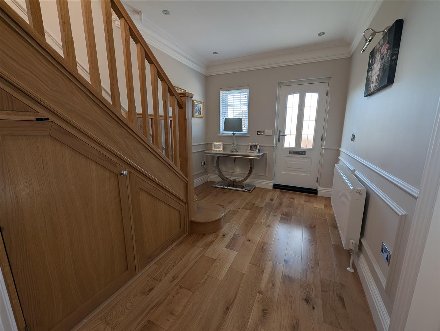 Composite door to front and staircase to first floor landing with storage under. Wall panelling, spotlights to ceiling, engineered oak flooring and two radiators.