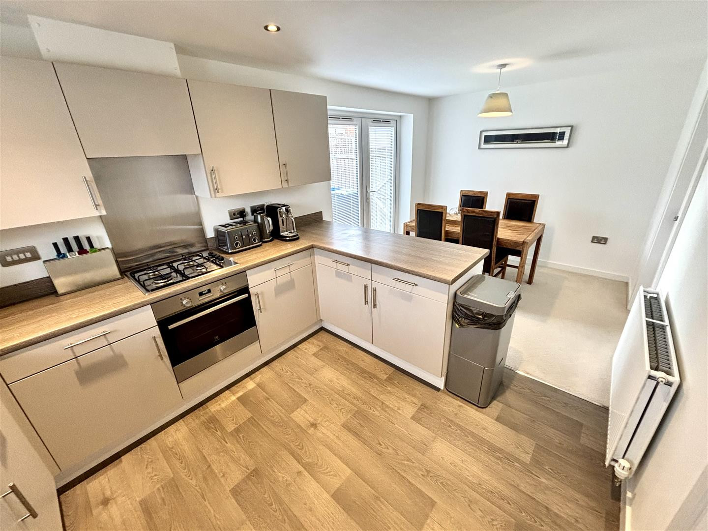 Fitted with a comprehensive range of units having contrasting work surfaces incorporating a breakfast bar and stainless steel sink unit with mixer tap, a built in stainless steel oven and hob with extractor over and integrated appliances including a fridge/freezer and dishwasher. Further features include recessed spotlighting, a radiator, a UPVC double glazed window and french doors opening in to the rear garden.