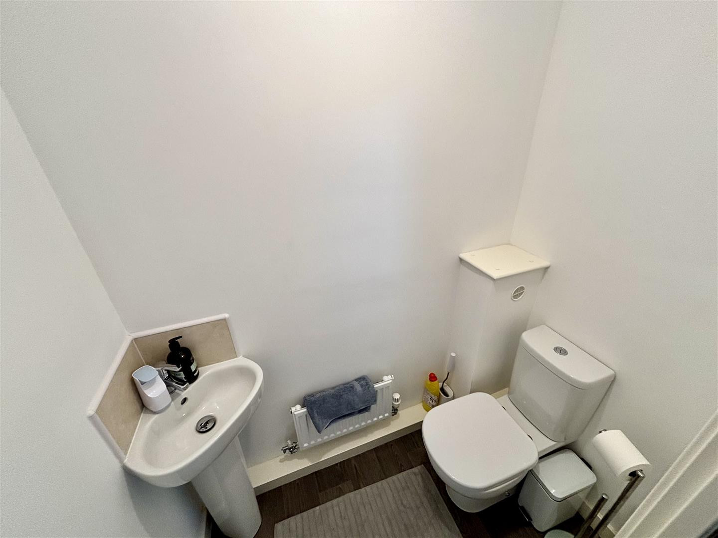 Comprising of a WC, pedestal wash basin, tiled splashback, extractor fan and radiator.