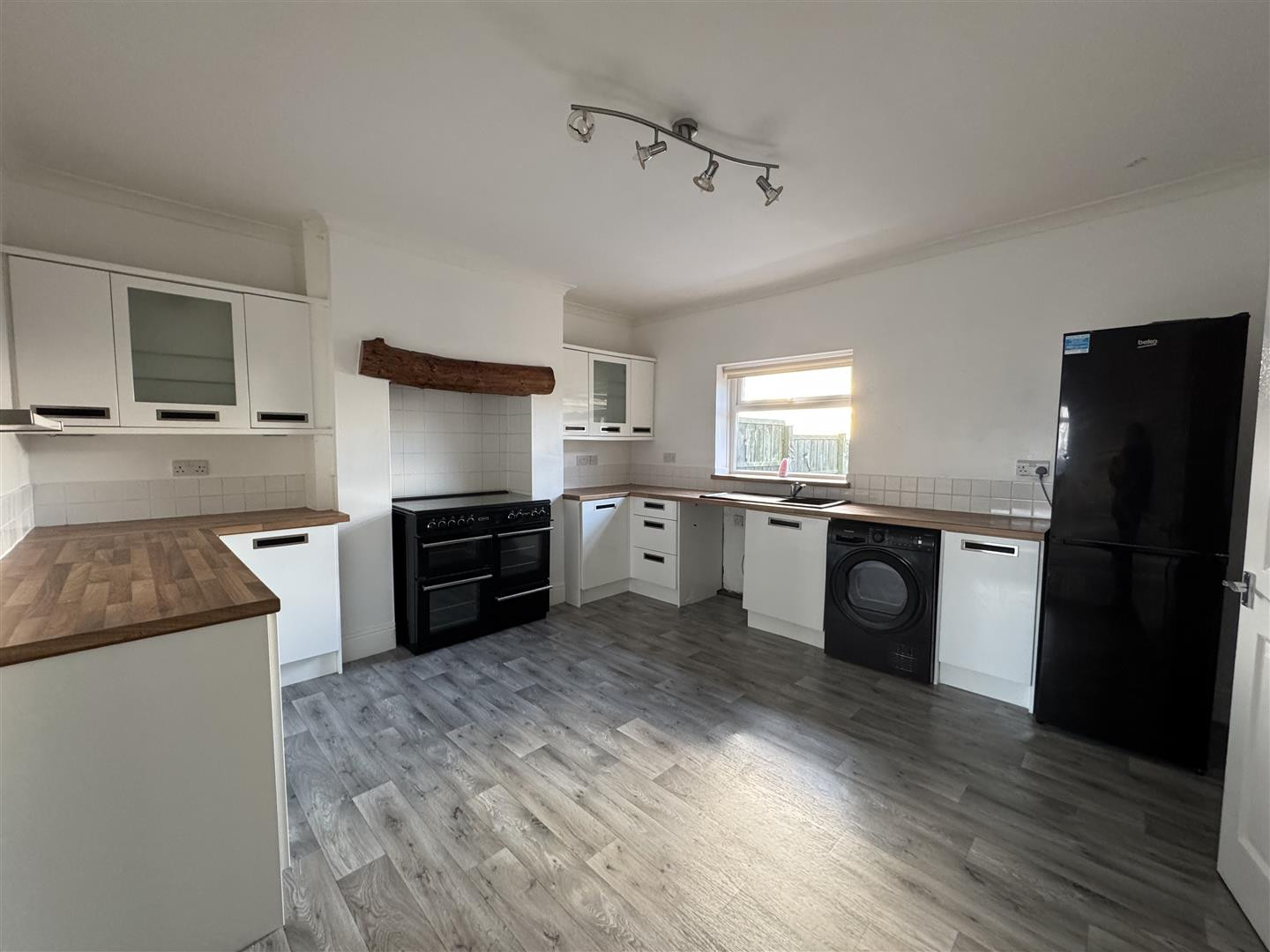 Fitted with a range of White High Gloss wall and base units, laminated working surfaces over, inset single drainer sink unit and mixer tap, tiled splash back, uPVC double glazed window, gas/electric cooker range with timber mantle and under lighting, glass fronted display cupboards, laminated floor, double central heating radiator, plumbing and space for washing machine and dish washer, under unit lighting and coving to ceiling.