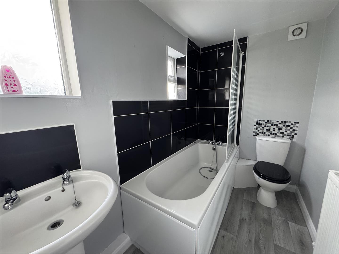 Fitted with a white suite including panelled bath having hand held shower and screen over, wc, pedestal wash hand basin, tiled splash backs, two UPVC double glazed window, double central heating radiator.