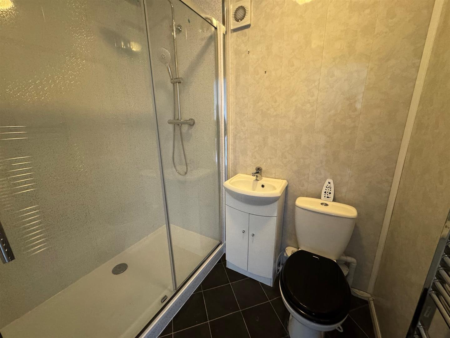 With corner shower cubicle having mains shower and laminated panelled inset, wc and wash basin in vanity unit, storage under, laminated panelled ceiling and walls and chrome heated towel rail.