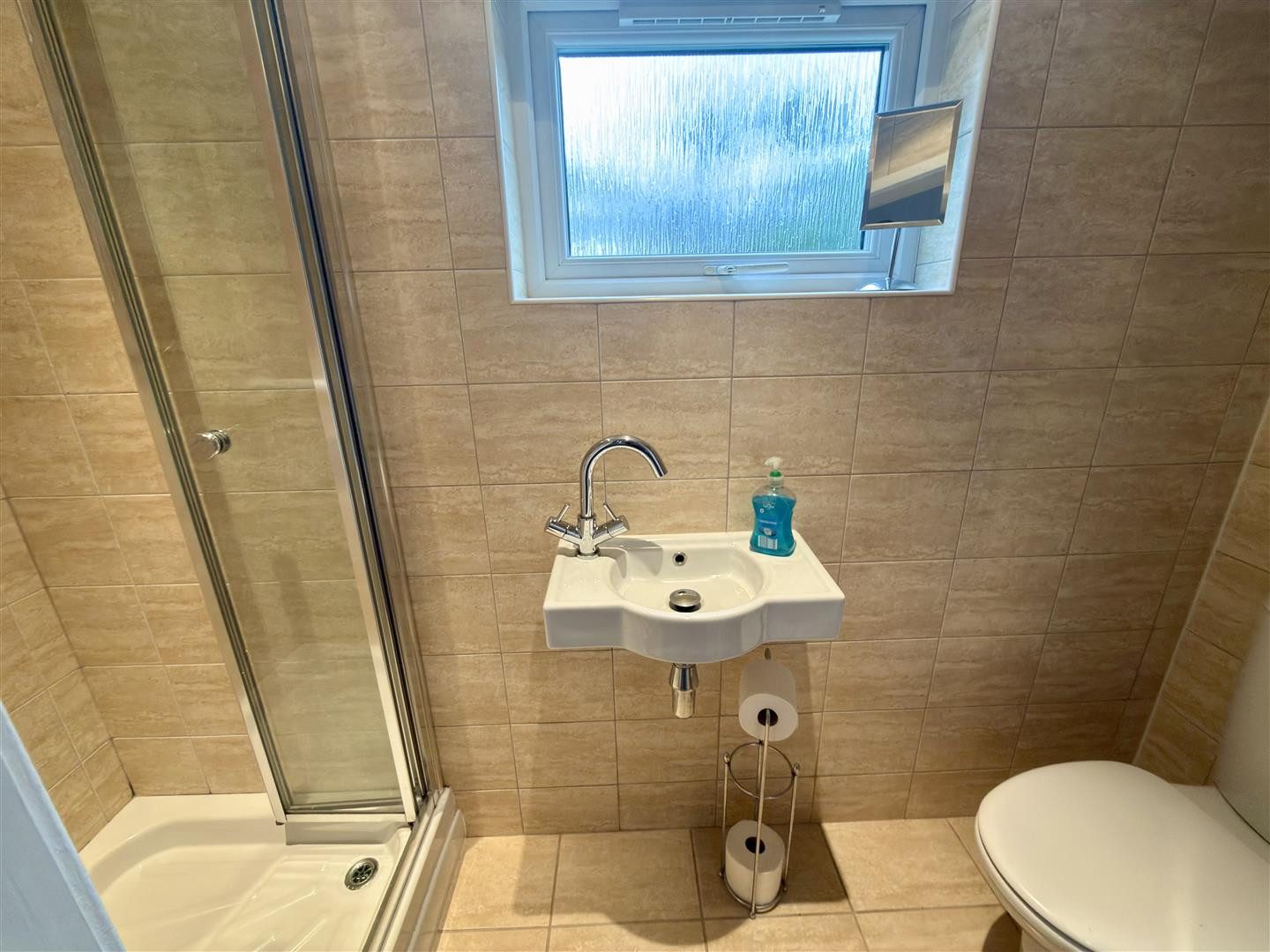Upvc double glazed obscure window to side, shower cubicle, low level w.c, wash hand basin and heated towel rail. Spotlights to ceiling and fully tiled walls and floor.