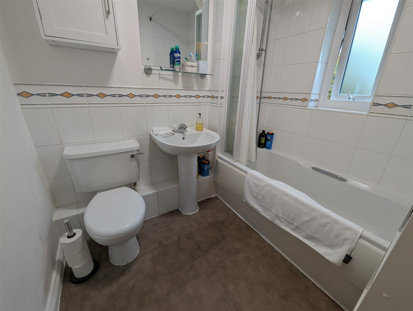 Upvc double glazed window to side, panelled bath with shower over, spray and screen, w.c, wash hand basin and part tiled walls.