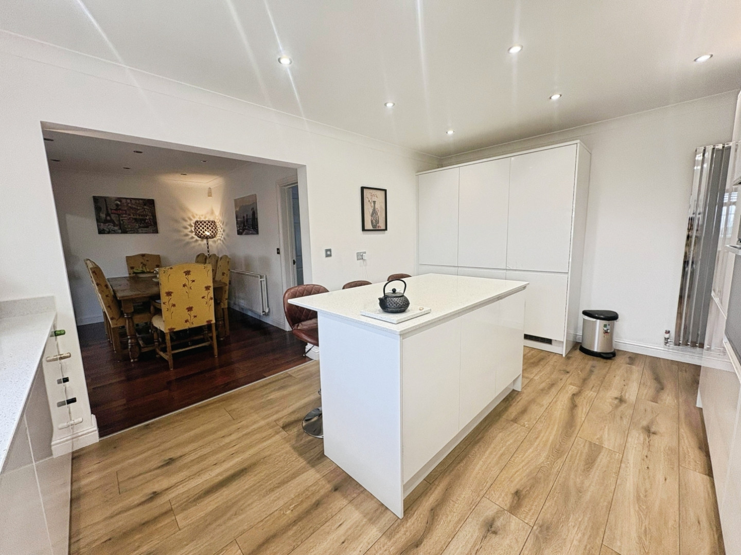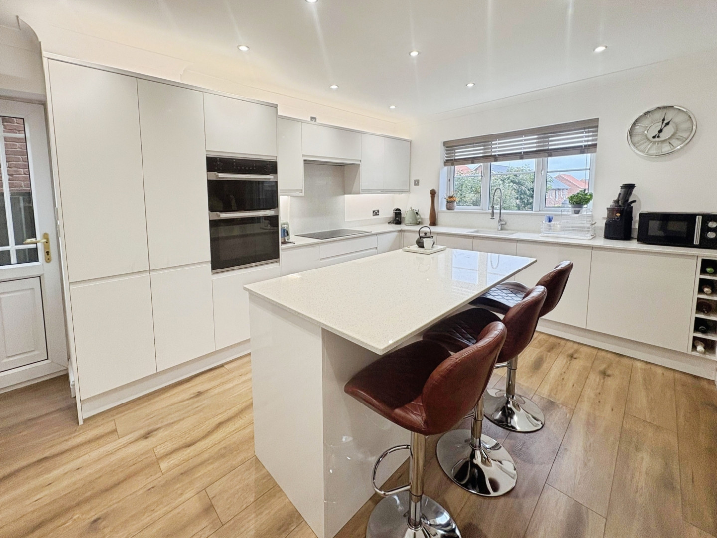 Extensively fitted with an array of White High Gloss wall and base units with white quartz working surfaces over, inset single bowl sink unit and mixer tap over, UPVC double glazed window with coordinating window sill. There are a range of integral appliances including induction hob with extractor hood over, double electric oven, washing machine dish washer and fridge and freezer, decorative wall radiator, coving to ceiling, spot lighting, wine rack and central island unit. UPVC double glazed door to the rear.