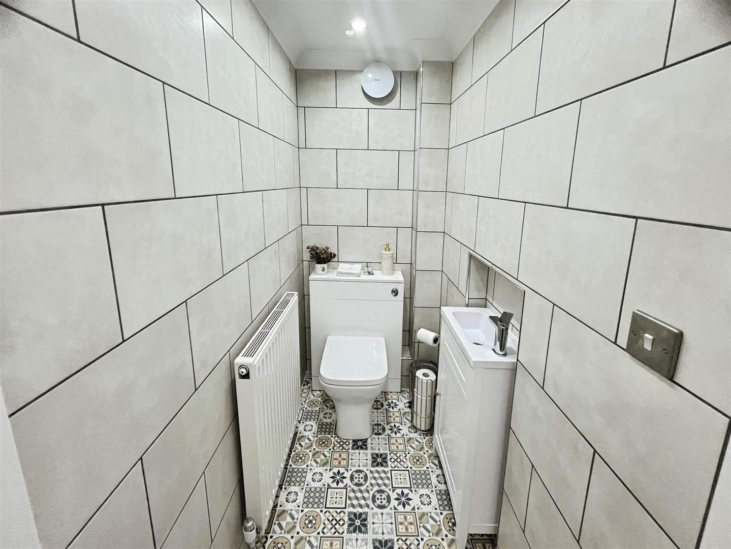Extensively fitted with a white suite including built in wc, wash hand basin in vanity unit and storage under, central heating radiator, tiled walls, tiled floor, coving to ceiling and spot lighting