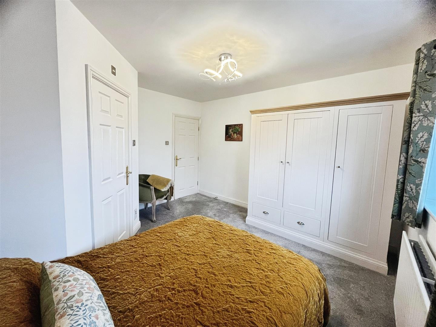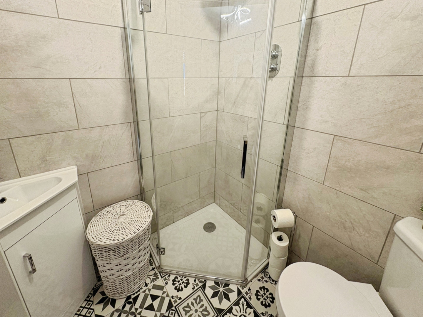 Extensively fitted with a double walk in shower cubicle with mains waterfall shower, wc, modern wash hand basin in wash stand, decorative wall radiator, majority tiled walls, tiled floor, UPVC double glazed dormer window, spot lighting, loft access and storage cupboard