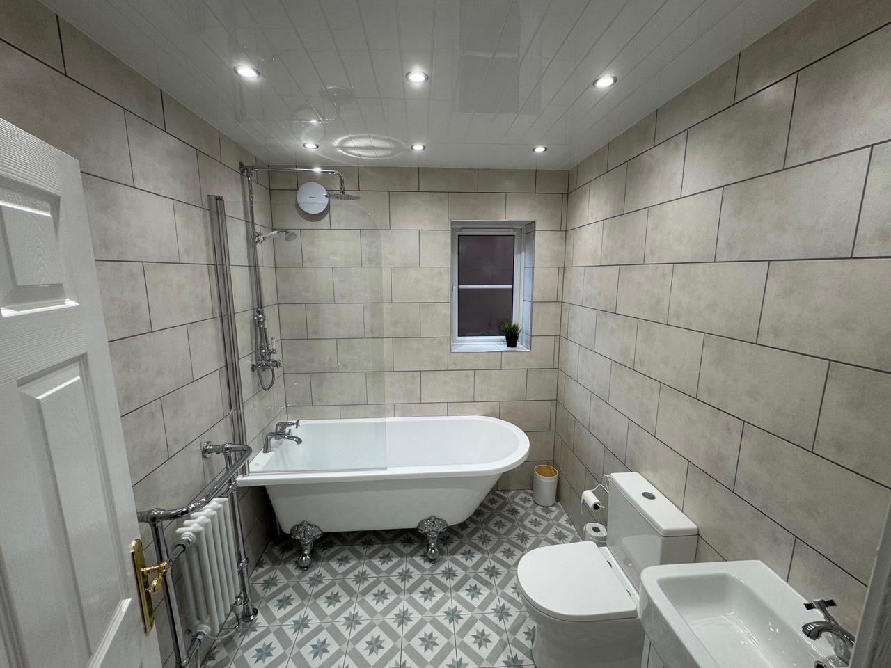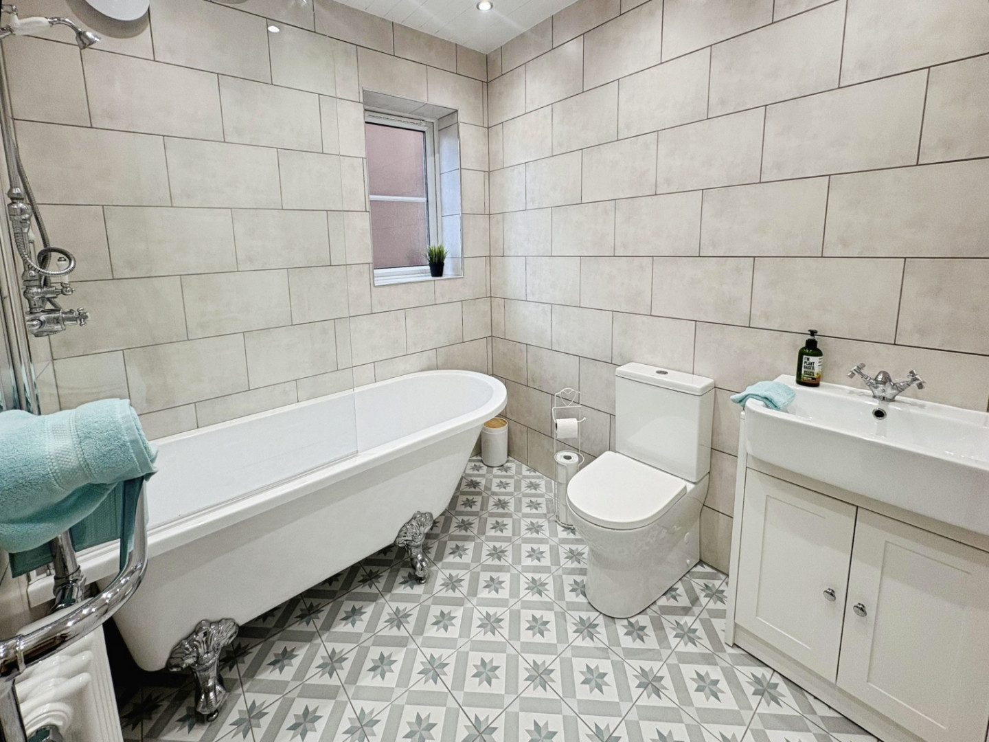 Extensively fitted including a white suite with clawfoot bath, mains waterfall shower over, shower screen, wc, wash hand basin in vanity unit and storage below, opaque UPVC double glazed window, decorative wall radiator, tiled walls, tiled floor, panelled ceiling and spot lighting