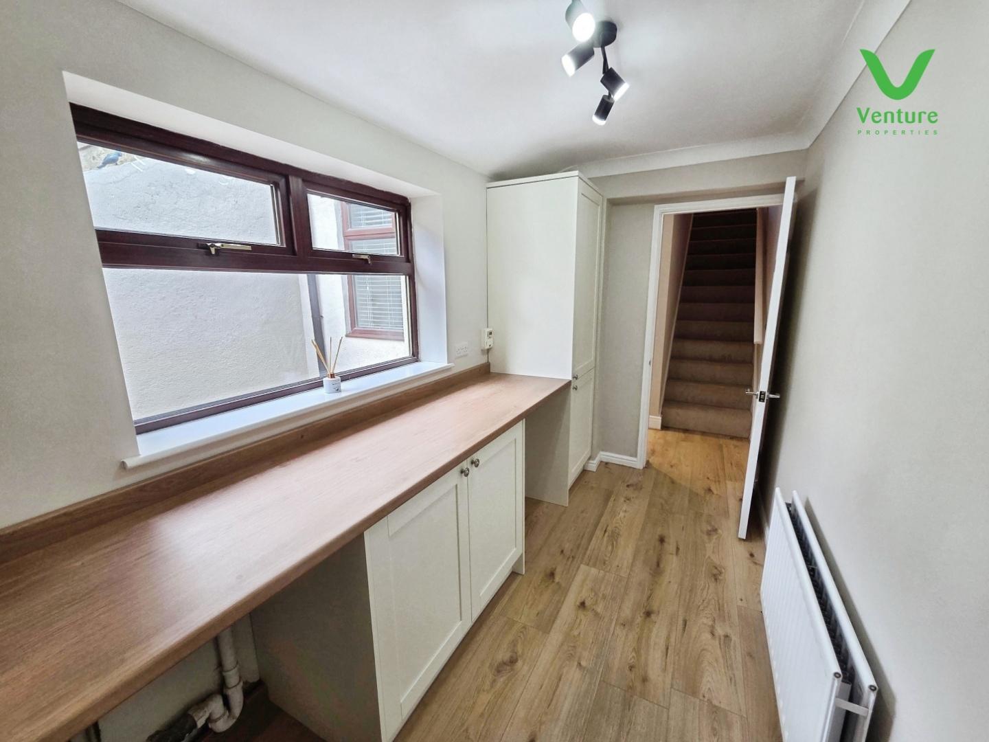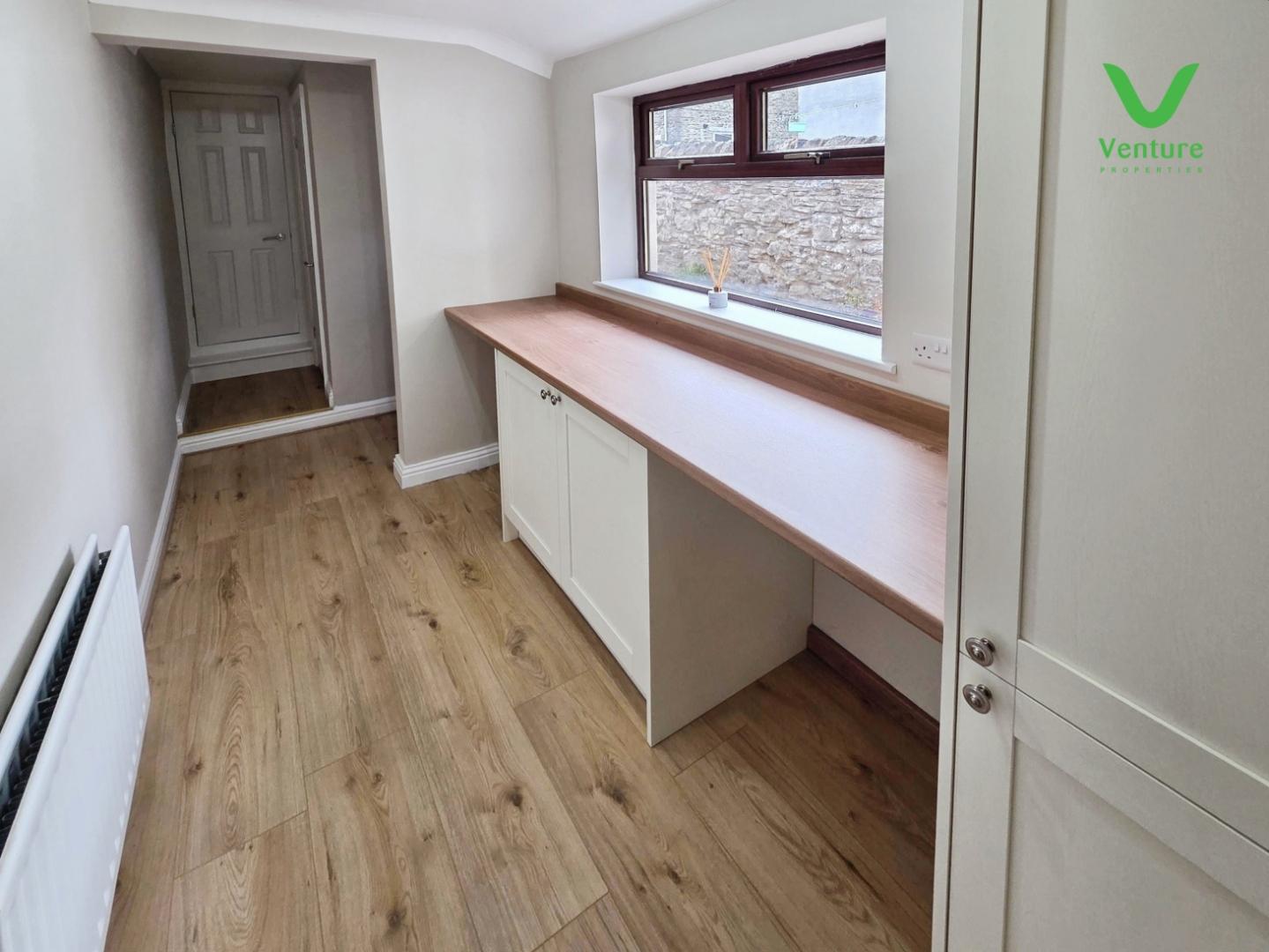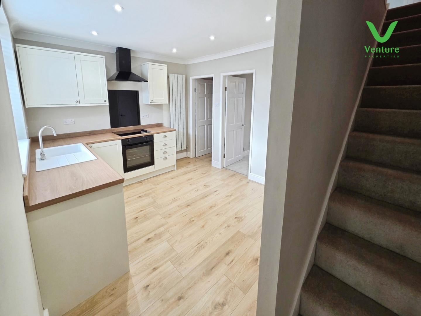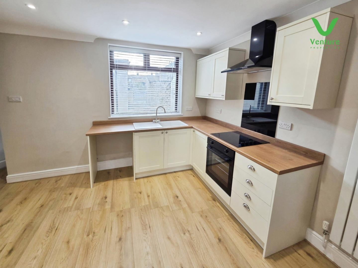 Fitted with a lovely new kitchen comprising of wall and base units with contrasting work surfaces over, sink unit with drainer and mixer tap, integrated electric oven and electric hob with extraction hood over, , space for fridge freezer, vertical radiator, storage cupboard and uPVC double glazed window to rear.
