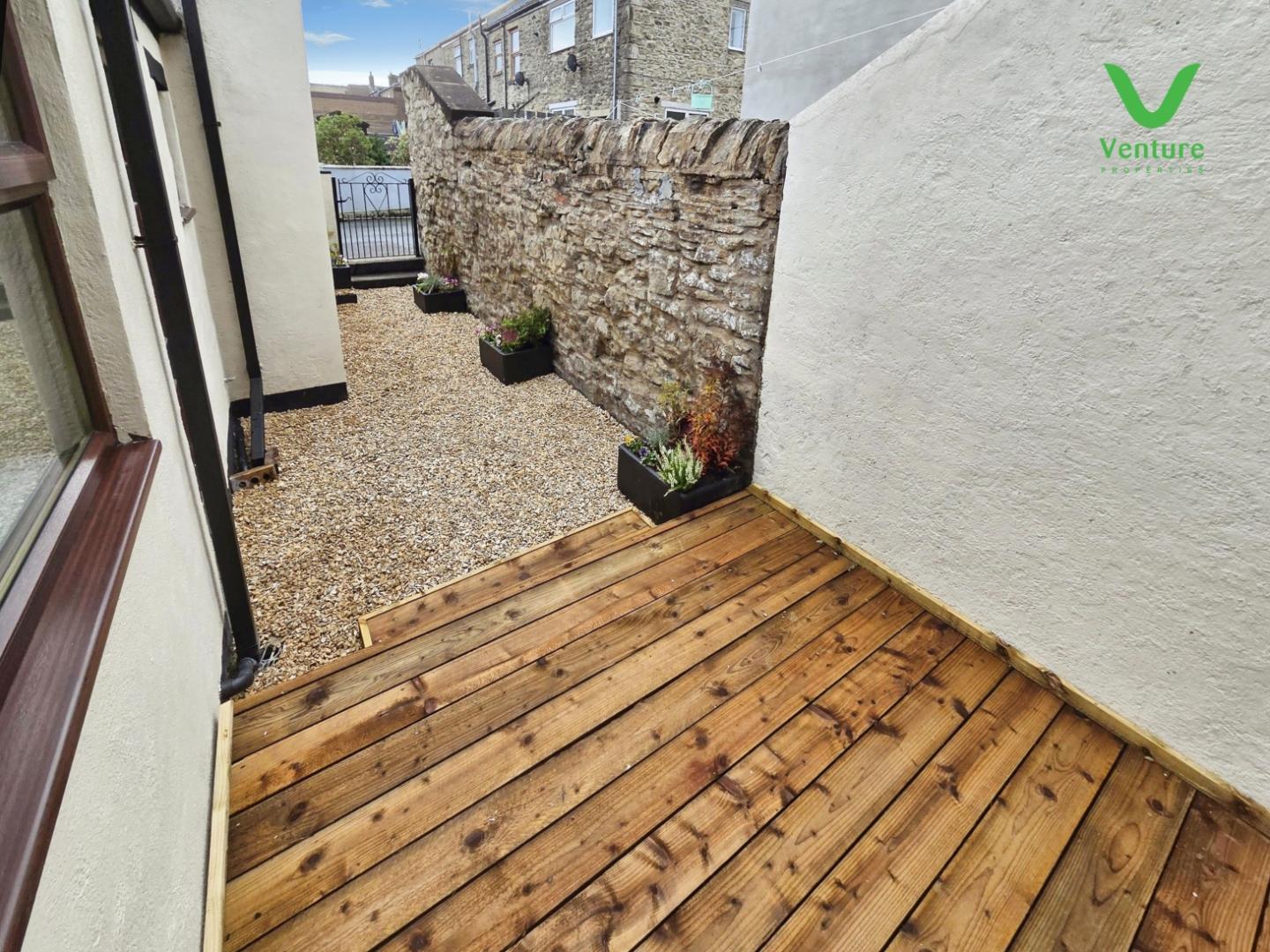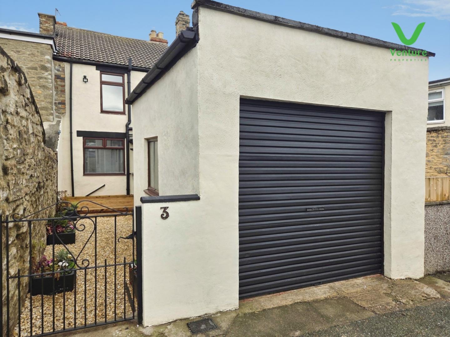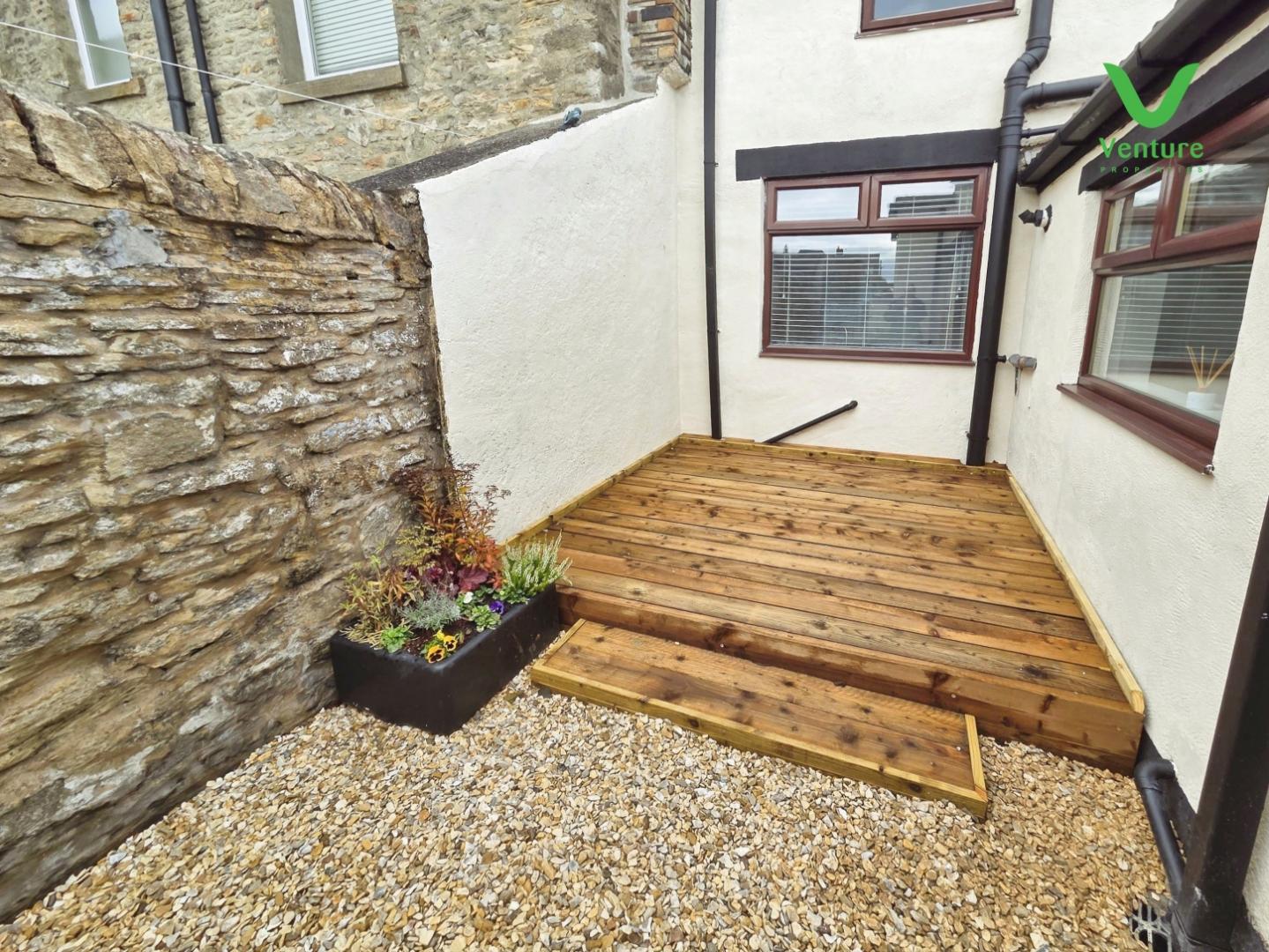 Externally To the rear is an enclosed, gravelled yard with a seating area and a single garage.
