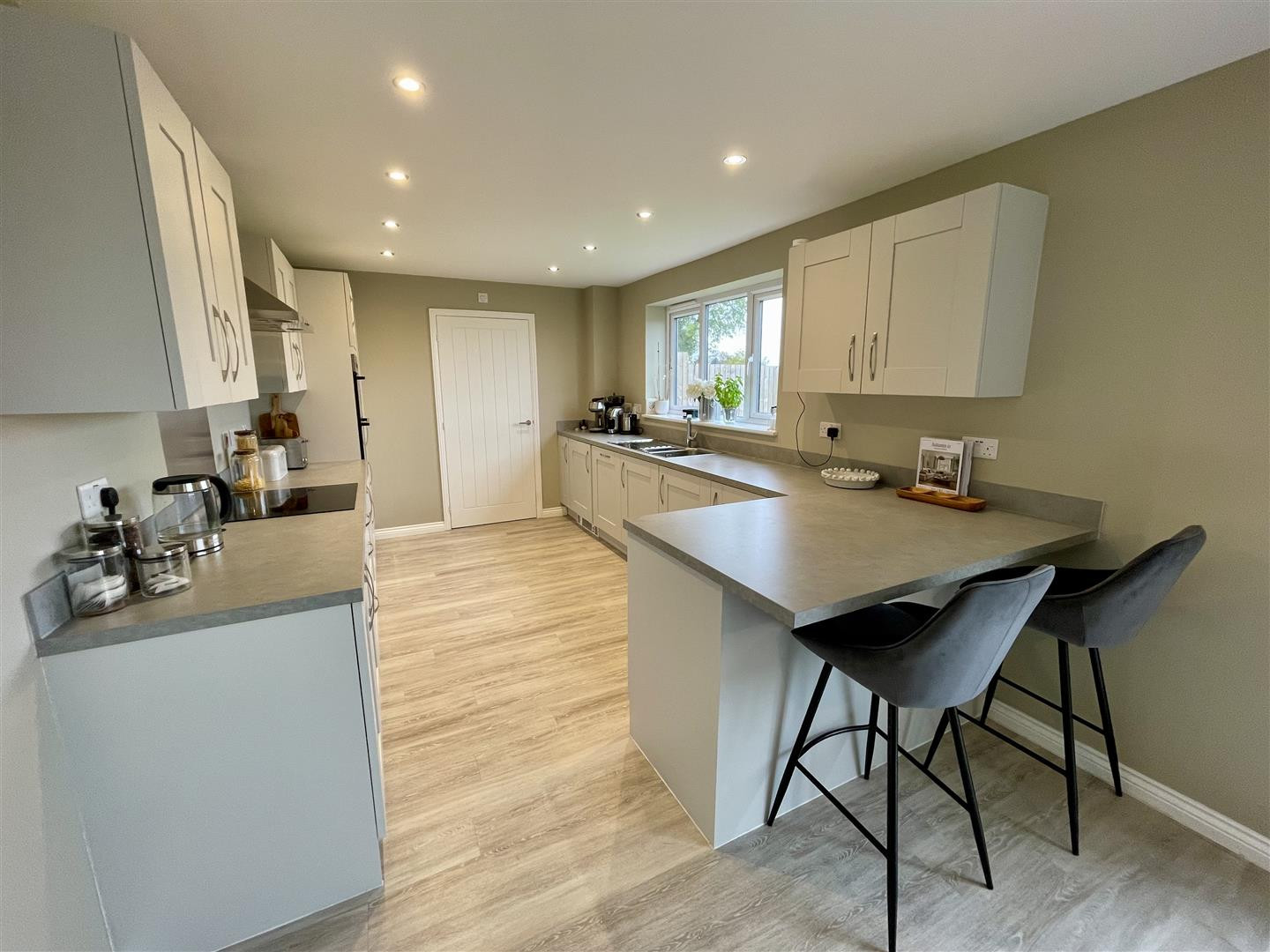 Fitted with wall, baser and drawer units incorporating a breakfast bar. Electric hob with extractor over and eye level double oven. Stainless steel sink with mixer tap. Integrated fridge freezer and dishwasher. Space for a dining table and chairs, spotlights to ceiling and French doors to rear.