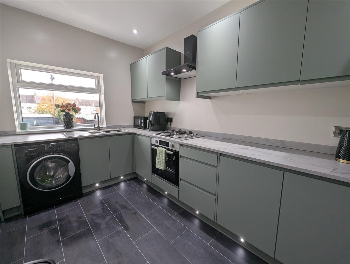 With a Upvc double glazed window to the rear. Fitted with a brand new range of sage glosee, wall base and drawer units with contrasting work surfaces and matching splashbacks, one and a half stainless steel sink unit with mixer taps, space for washing machine, vinyl flooring and ceiling spotlights.