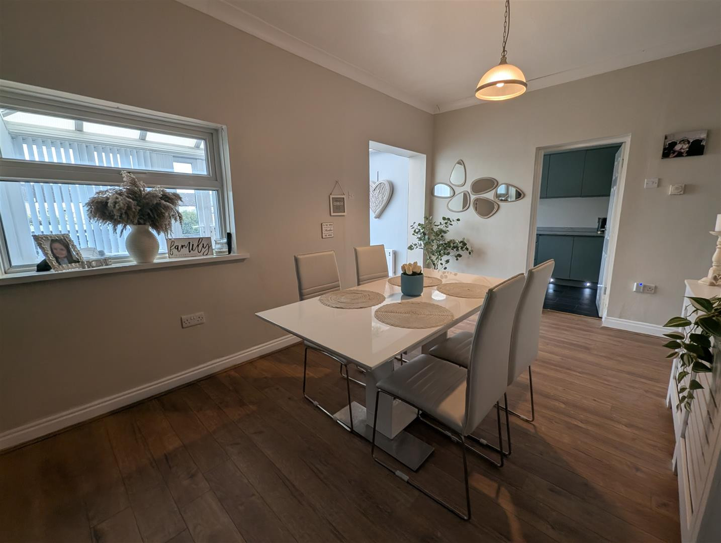 Open plan from the dining room with laminate flooring and Upvc double doors leading onto the rear decking.
