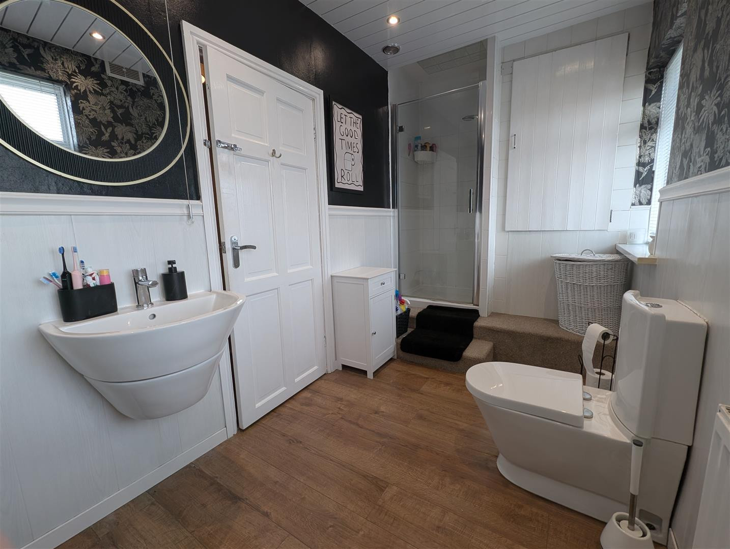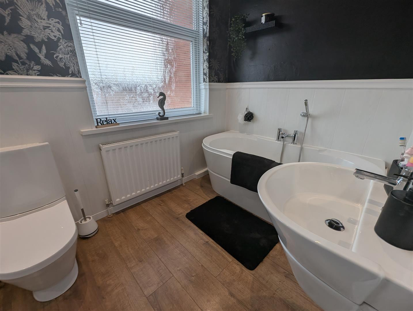 Fitted with a modern white suite comprising panelled bath with shower fitment, wash hand basin, low level wc, separate shower cubicle, laminate flooring, central heating radiator, two double glazed windows and cupboard housing the combination style boiler.