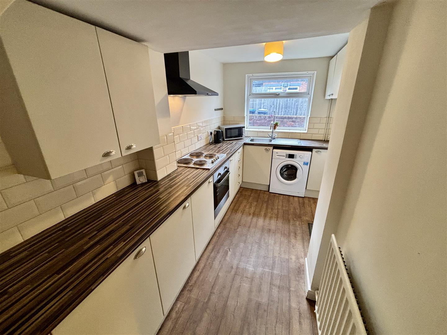 Open plan to the dining room creating a fantastic space for entertaining the refitted kitchen comprises of a range of base and wall units having contrasting worktops incorporating a stainless steel sink unit with mixer tap, built in stainless steel oven, electric hob and washing machine. Further features include a UPVC double glazed window to the rear, door to the side and radiator.