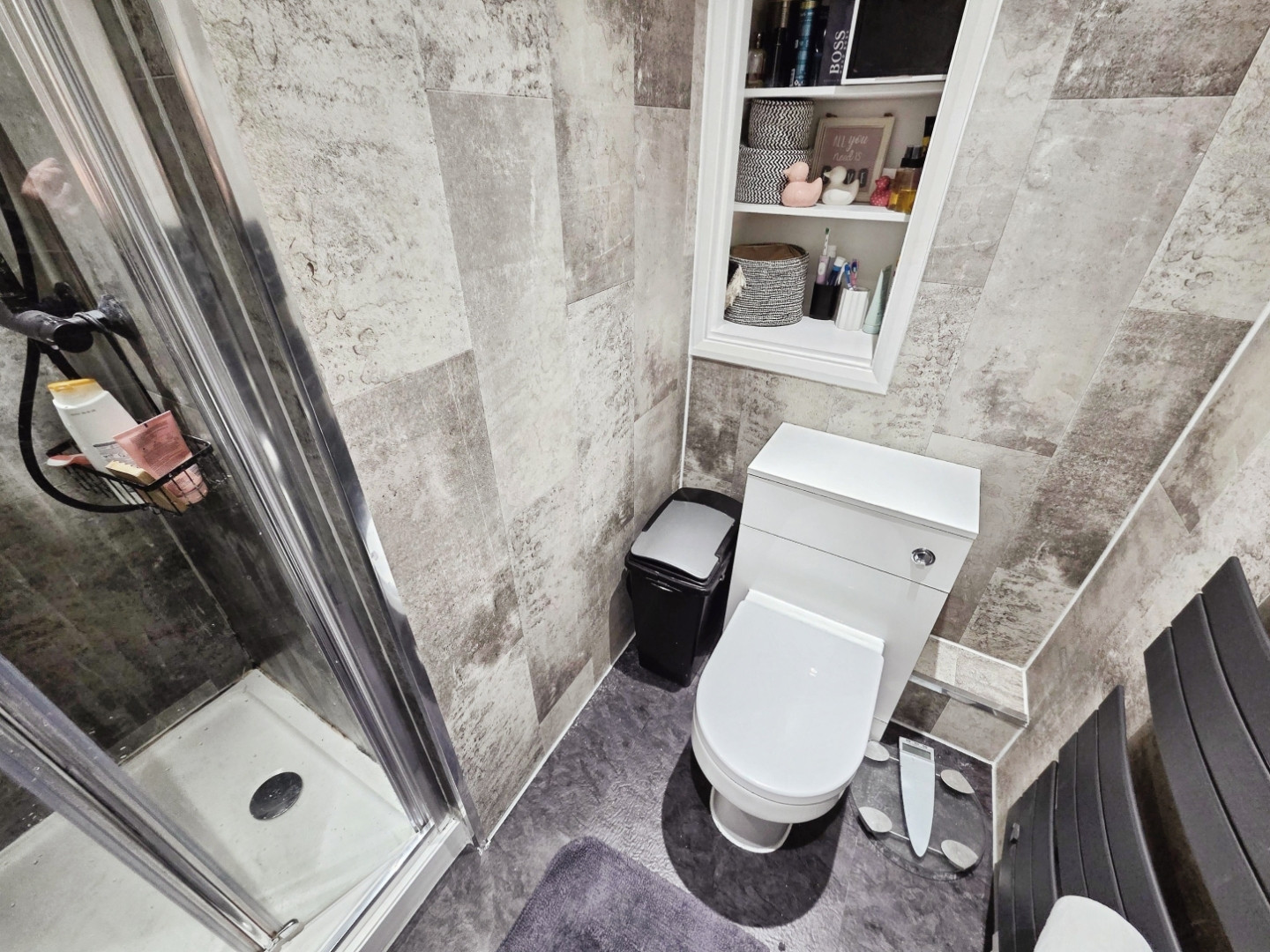 Re Fitted with a shower cubicle Having mains rainfall shower over, wc, wash hand basin set to vanity unit and black heated towel rail.