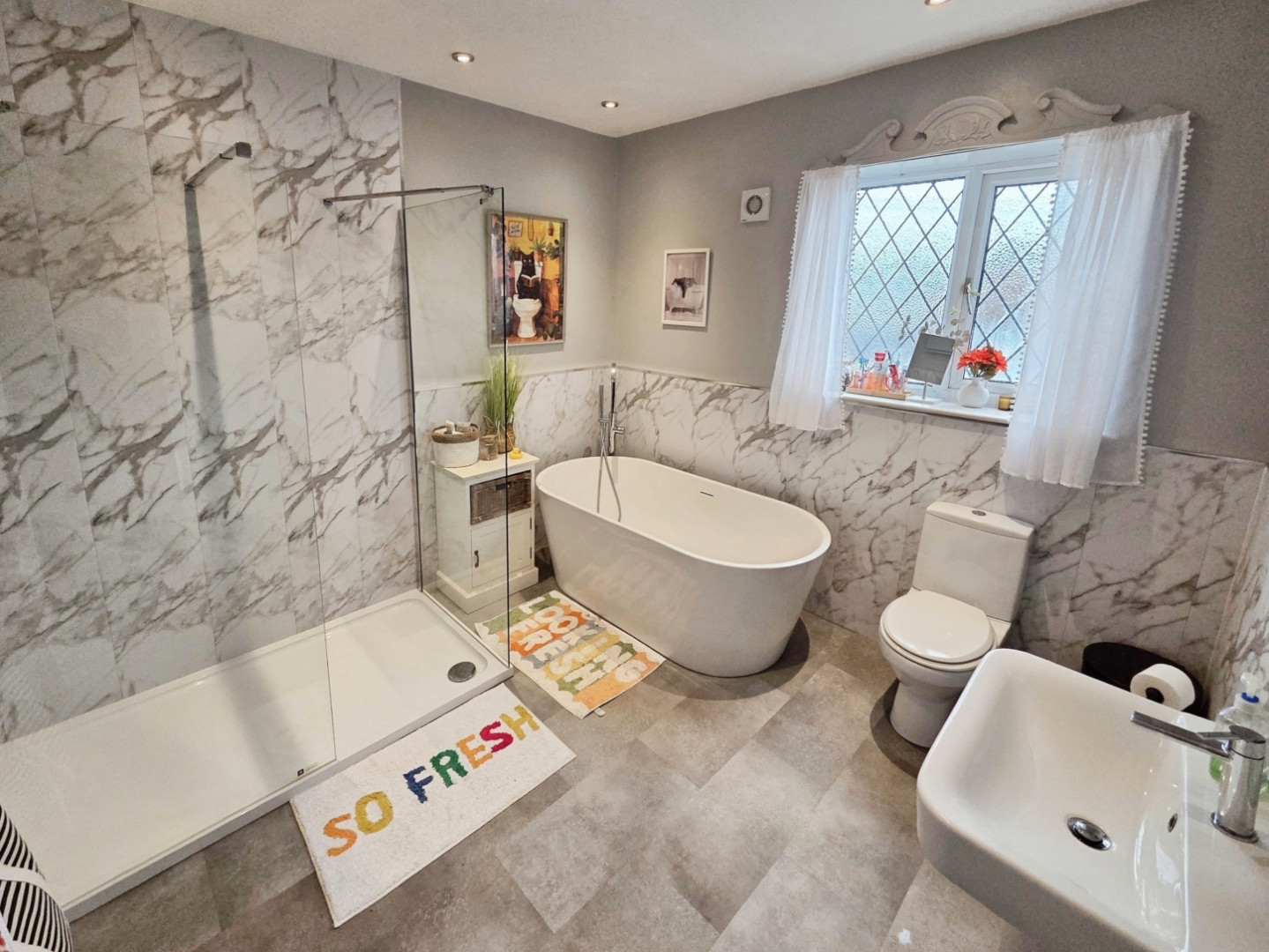 A large bathroom fitted with a free standing bath, wc, wash hand basin, double shower unit with mains shower, central heating radiator and spotlights to ceiling.