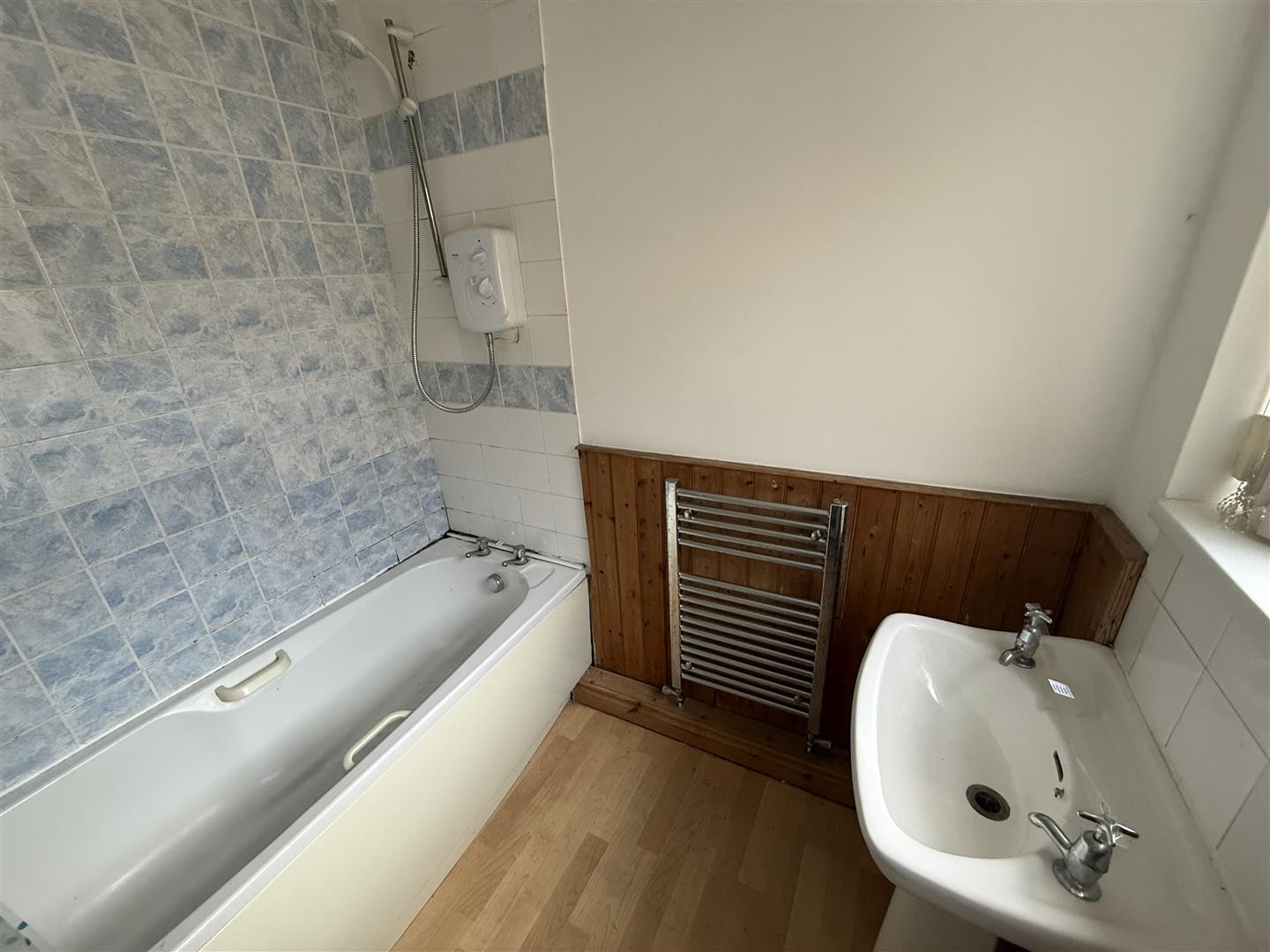 With a suite comprising panelled bath with overhead shower, pedestal wash hand basin and low level W,C.