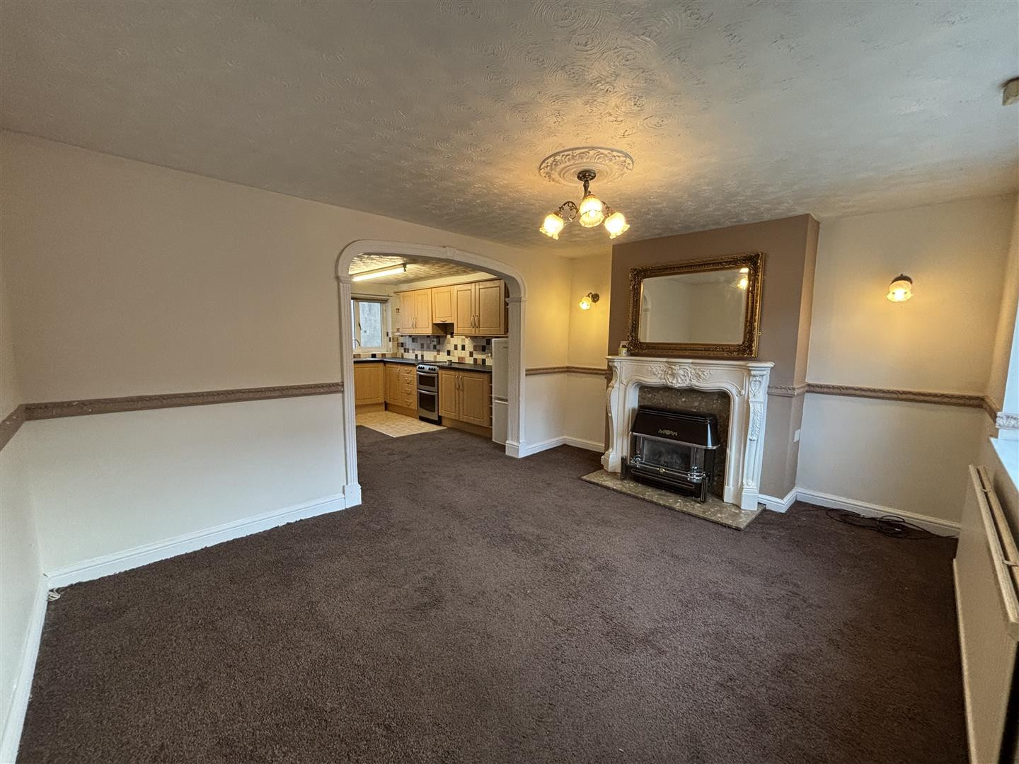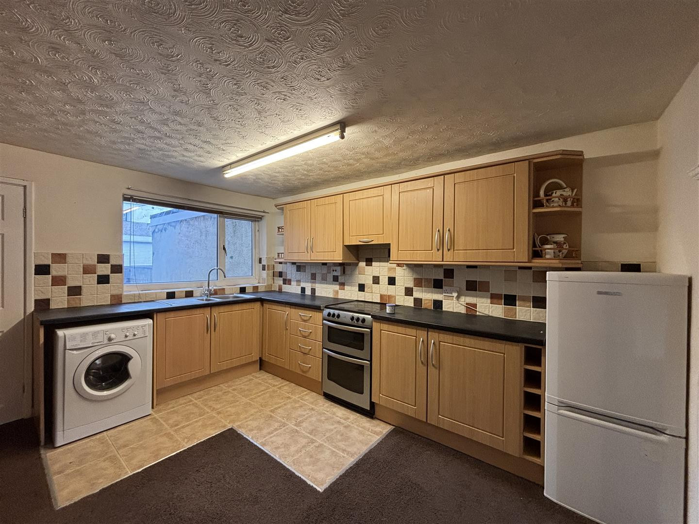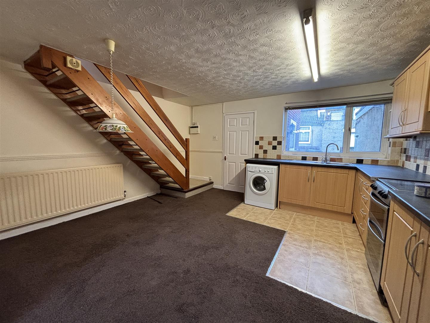 Fitted with a range of wall and base units with contrasting work surfaces, one and a half bowl sink and drainer with mixer tap, plumbing for washing machine slot for electric oven, space for fridge freezer and dining table as, open staircase to first floor and uPVC double glazed window to rear.