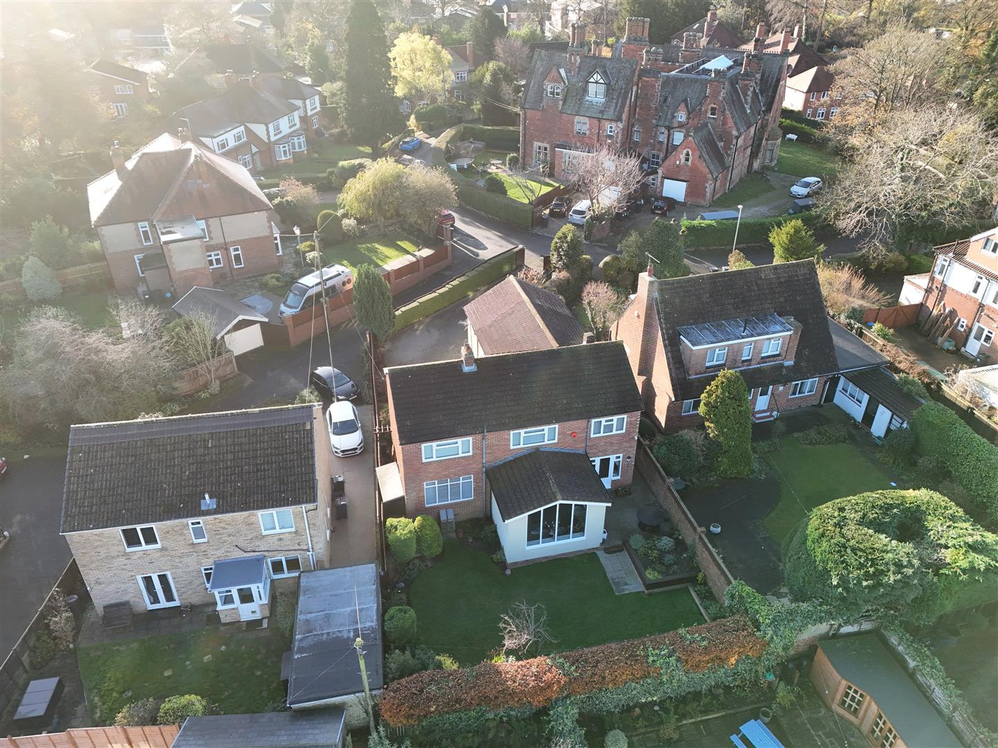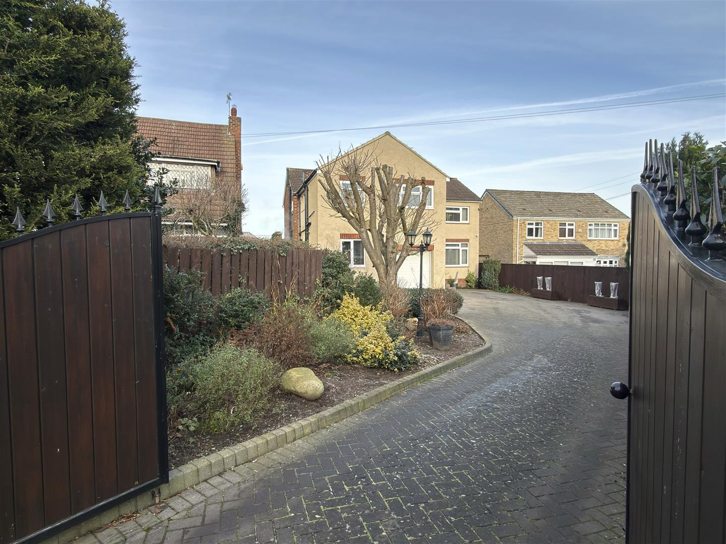 To the front there is gated access to a large block paved driveway providing off street parking for several vehicles. Well established gardens with plants, trees and shrubs.