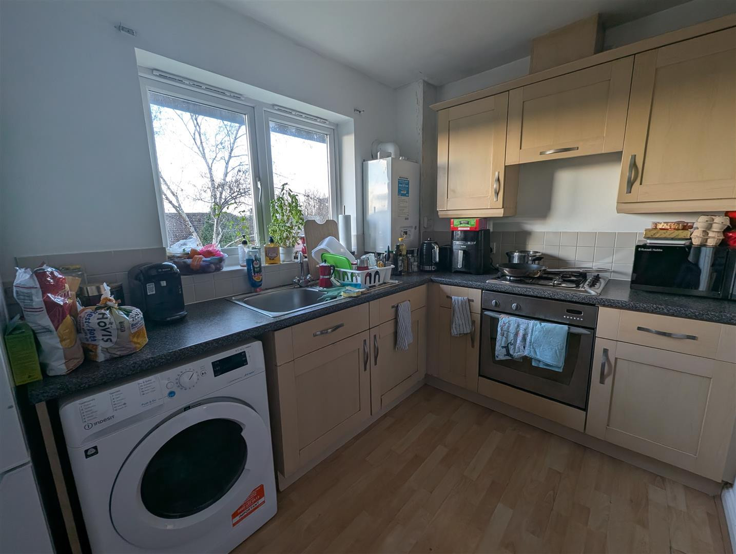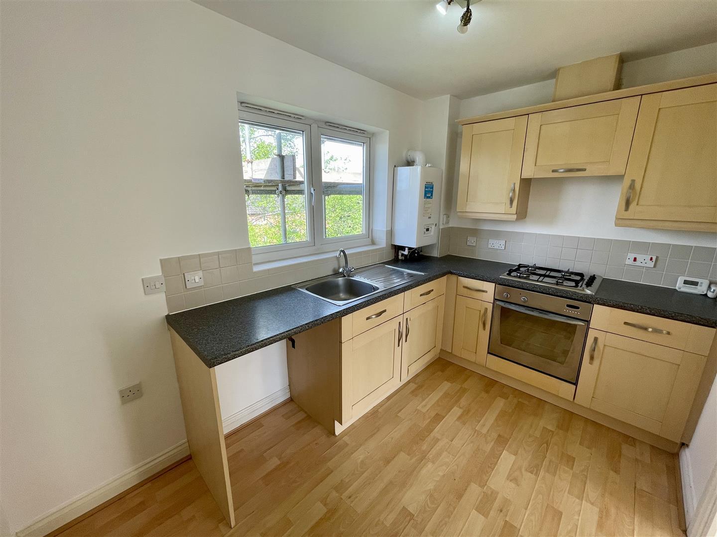 Upvc double glazed window to rear, fitted with medium beech wall, base and drawer units, integrated four ring gas hob with extractor over and oven. Stainless steel sink with mixer tap, space for a washing machine and fridge freezer. Laminate flooring and wall mounted boiler