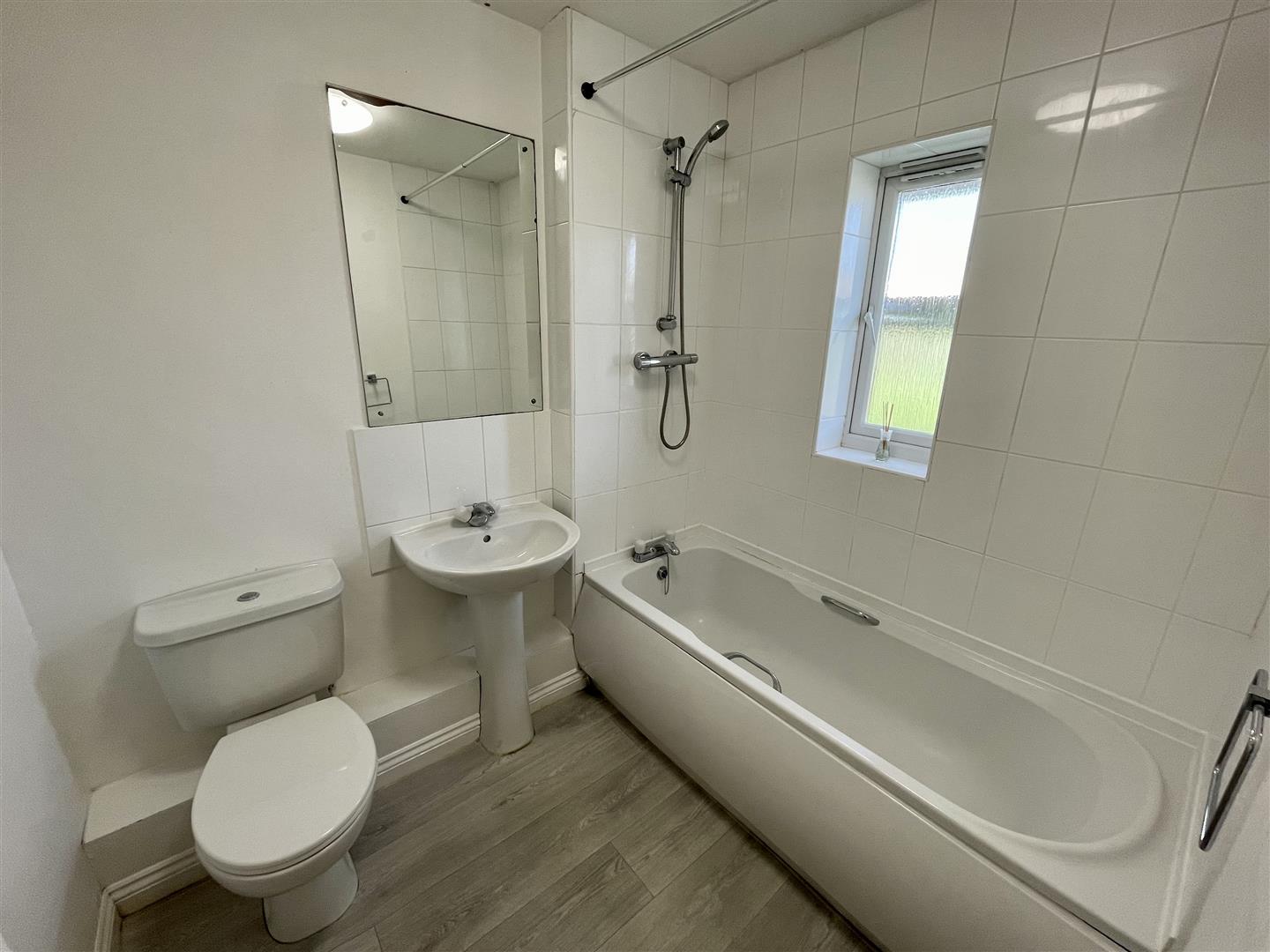 Upvc double glazed obscure window to side, panelled bath with shower over, w.c and wash hand basin. Radiator.