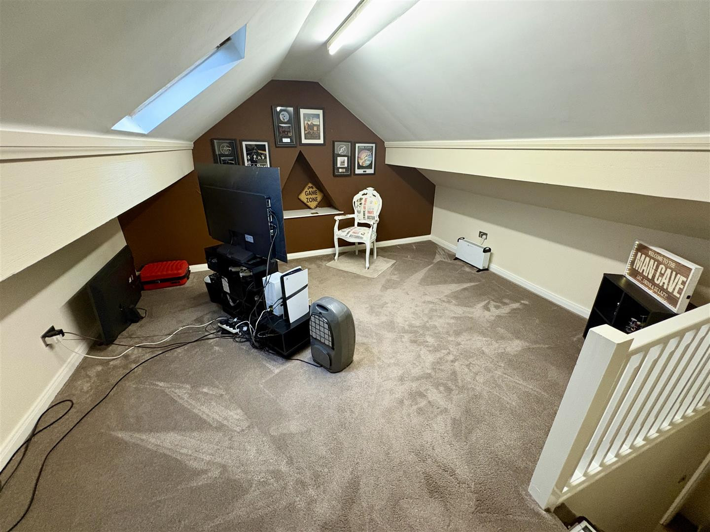 Spacious loft room for storage with velux window and storage cupboard.