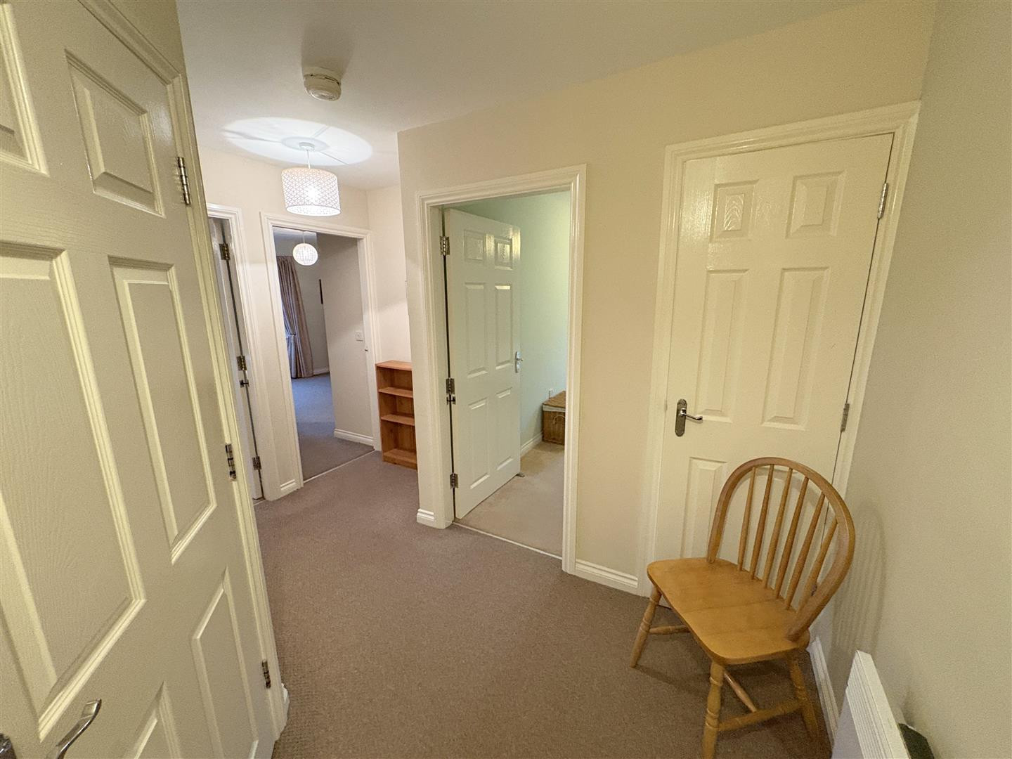 Fitted with panelled bath with shower over and screen, low level w.c. and wash hand basin. Heated towel rail and part tiled walls.