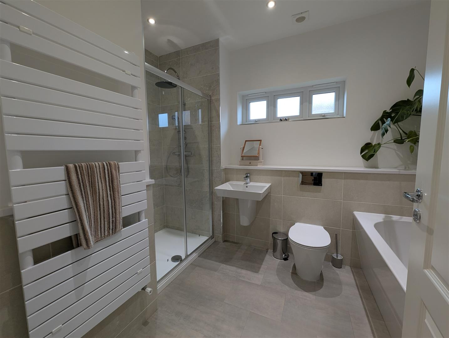 Upvc double glazed obscure window to side, walk in shower cubicle with waterfall and spray, bath, low level, back to wall w.c and wall mounted wash hand basin. Heated towel rail, part tiled walls and spotlights to ceiling.