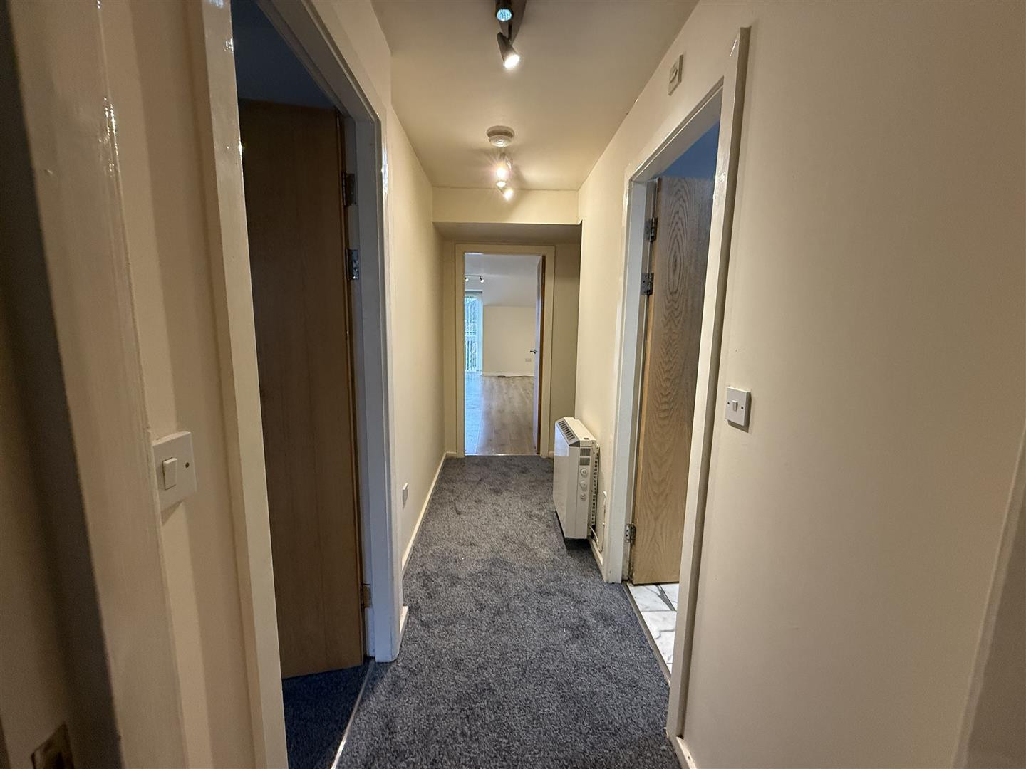 Entrance door, storage heater, laminate flooring and intercom system.
