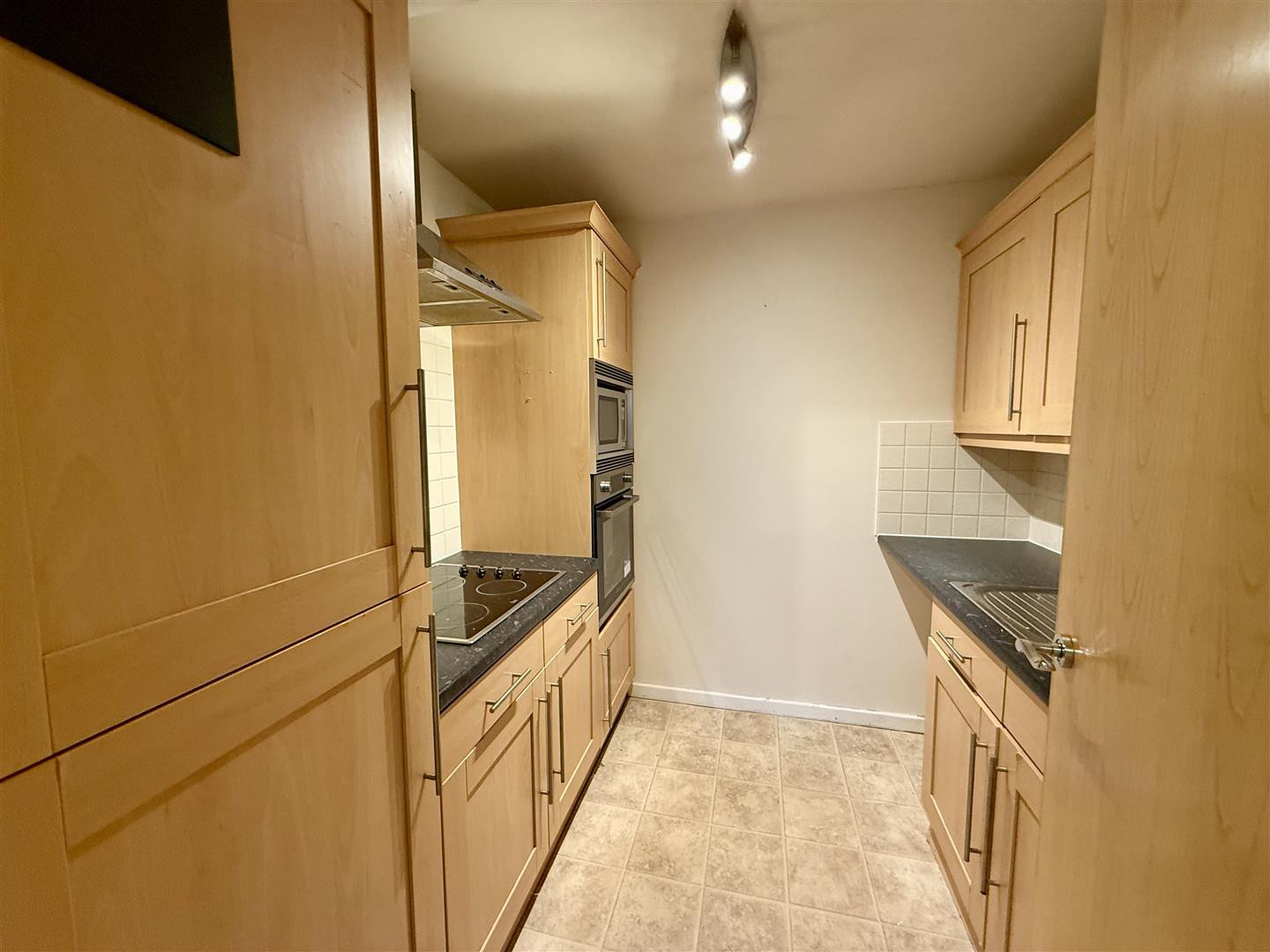 Fitted with wall, base and drawer units, contrasting work surfaces, electric hob with eye level oven, integrated fridge freezer and microwave. Stainless steel sink and space for washing machine. Laminate flooring.