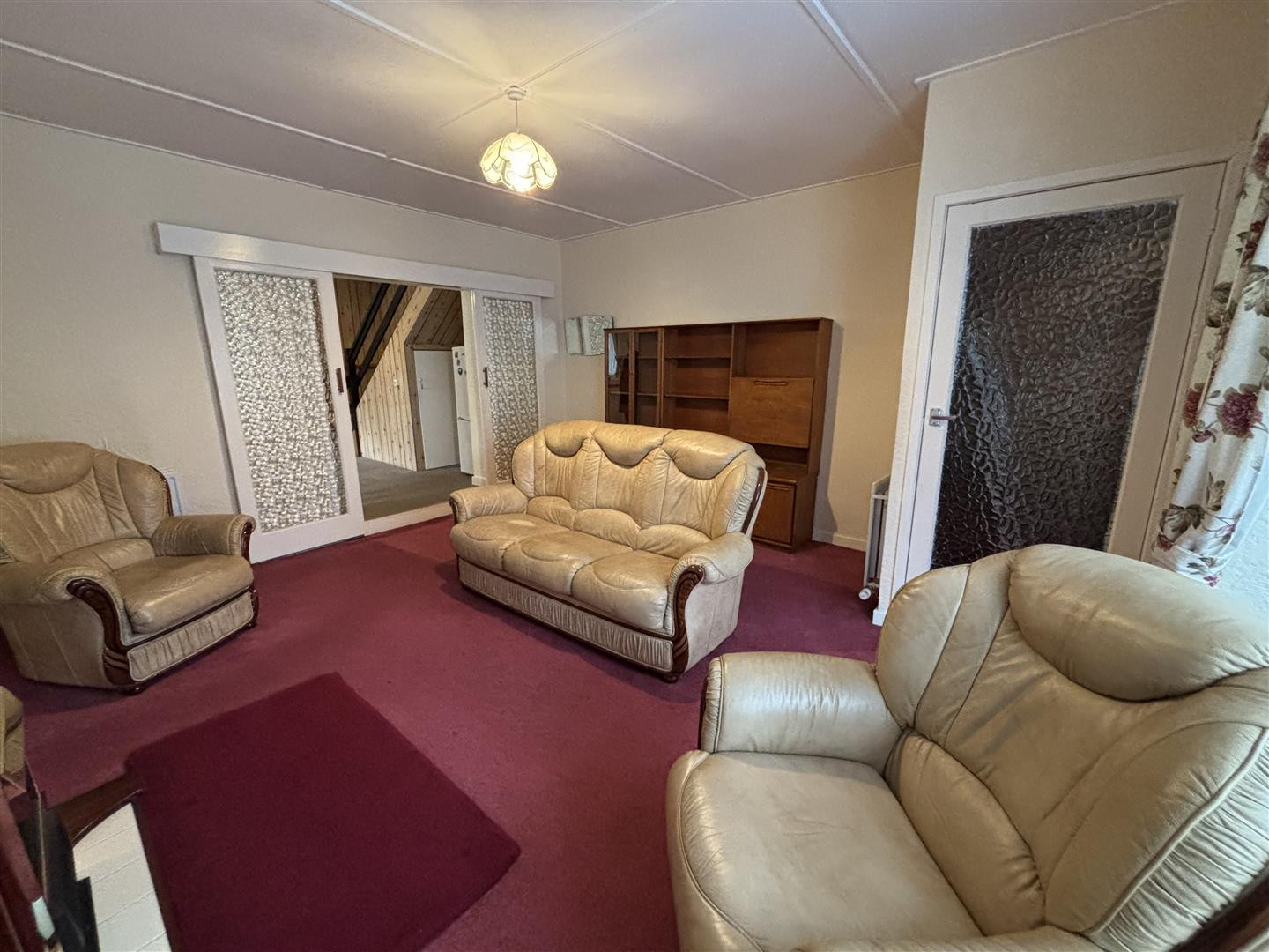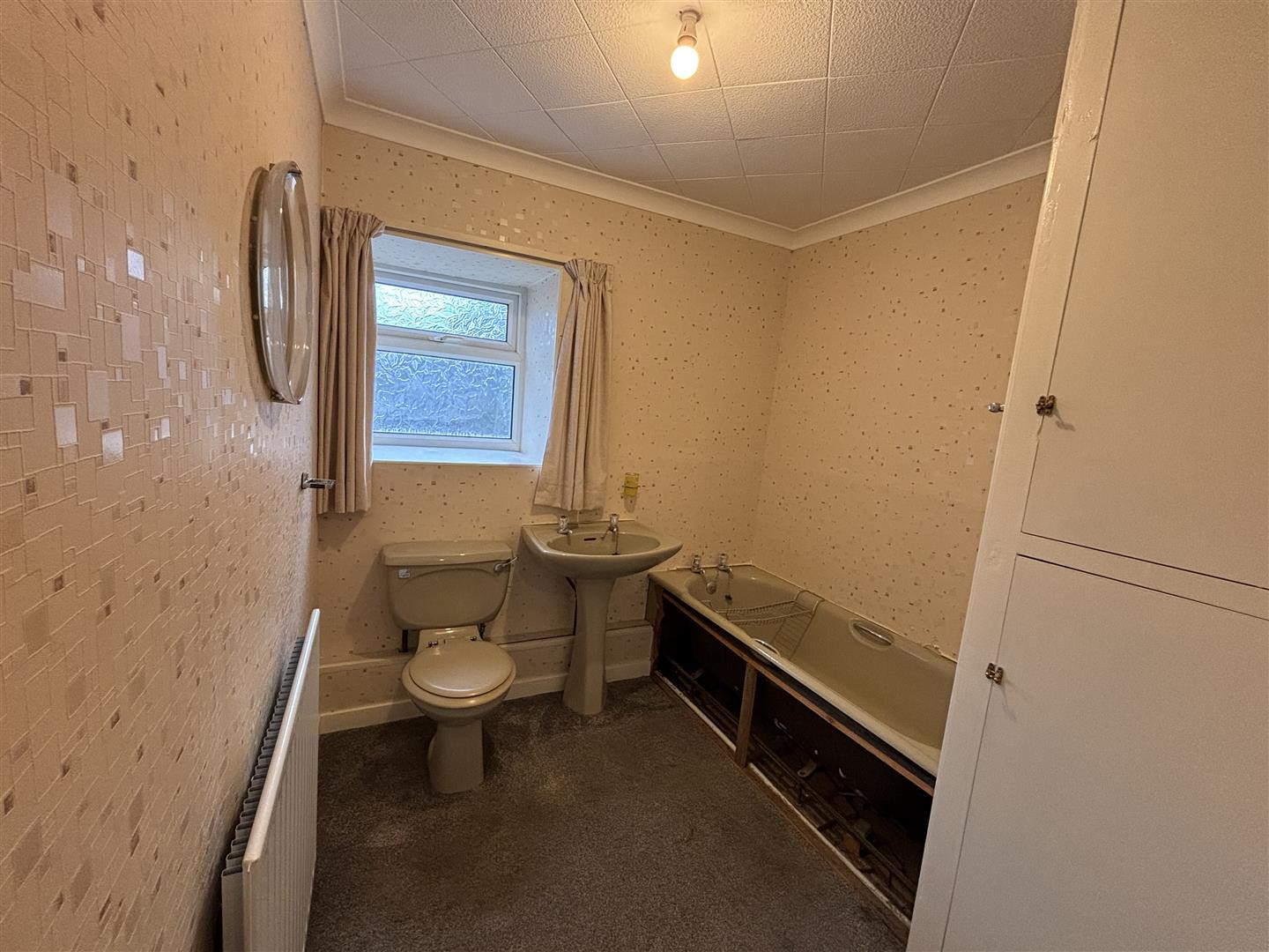 Fitted with a coloured suite including panelled bath, pedestal wash hand basin, wc, opaque UPVC double glazed window, central heating radiator, tiled splash backs and storage cupboard