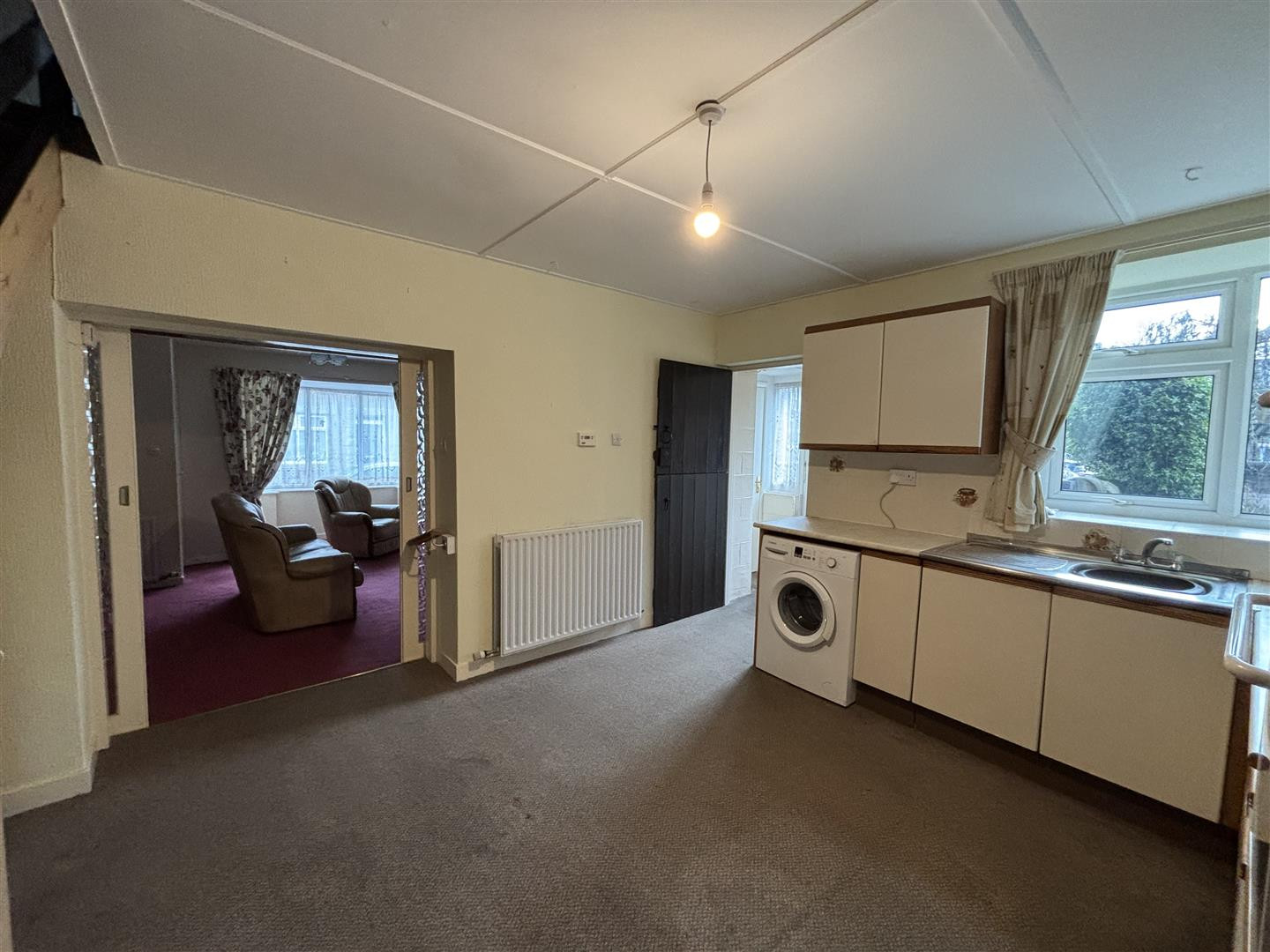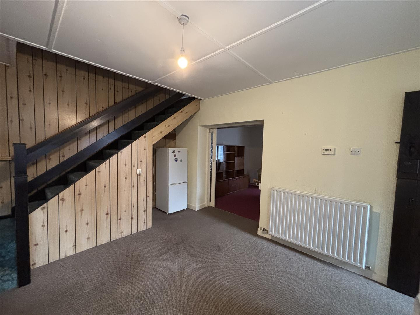 Fitted with a range of laminated wall and base units, laminated working surfaces over, inset single drainer sink nit, mixer tap over, UPVC double glazed window, integral appliances including electric double oven, electric hob, extractor hood over, double central heating radiator, plumbing and space for washing machine, understairs storage cupboard, open plan staircase to the first floor and ample space for a dining table as required.
