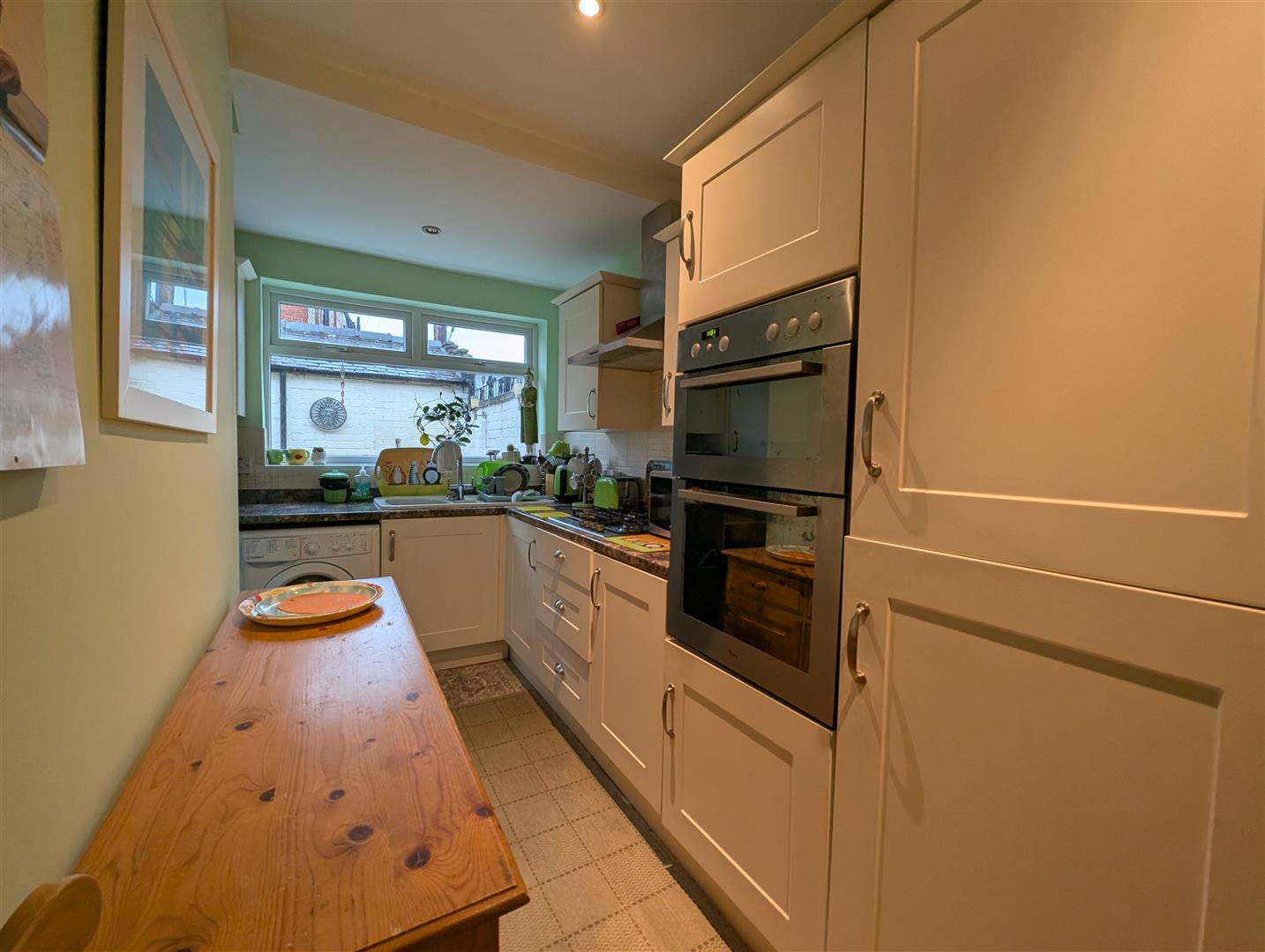 Situated to the rear with a modern range of wall and floor units with contrasting worksurfaces, integrated oven, hob and overhead extractor, plumbing for an automatic washing machine, part tiled walls, double glazed window to rear elevation and rear back door.