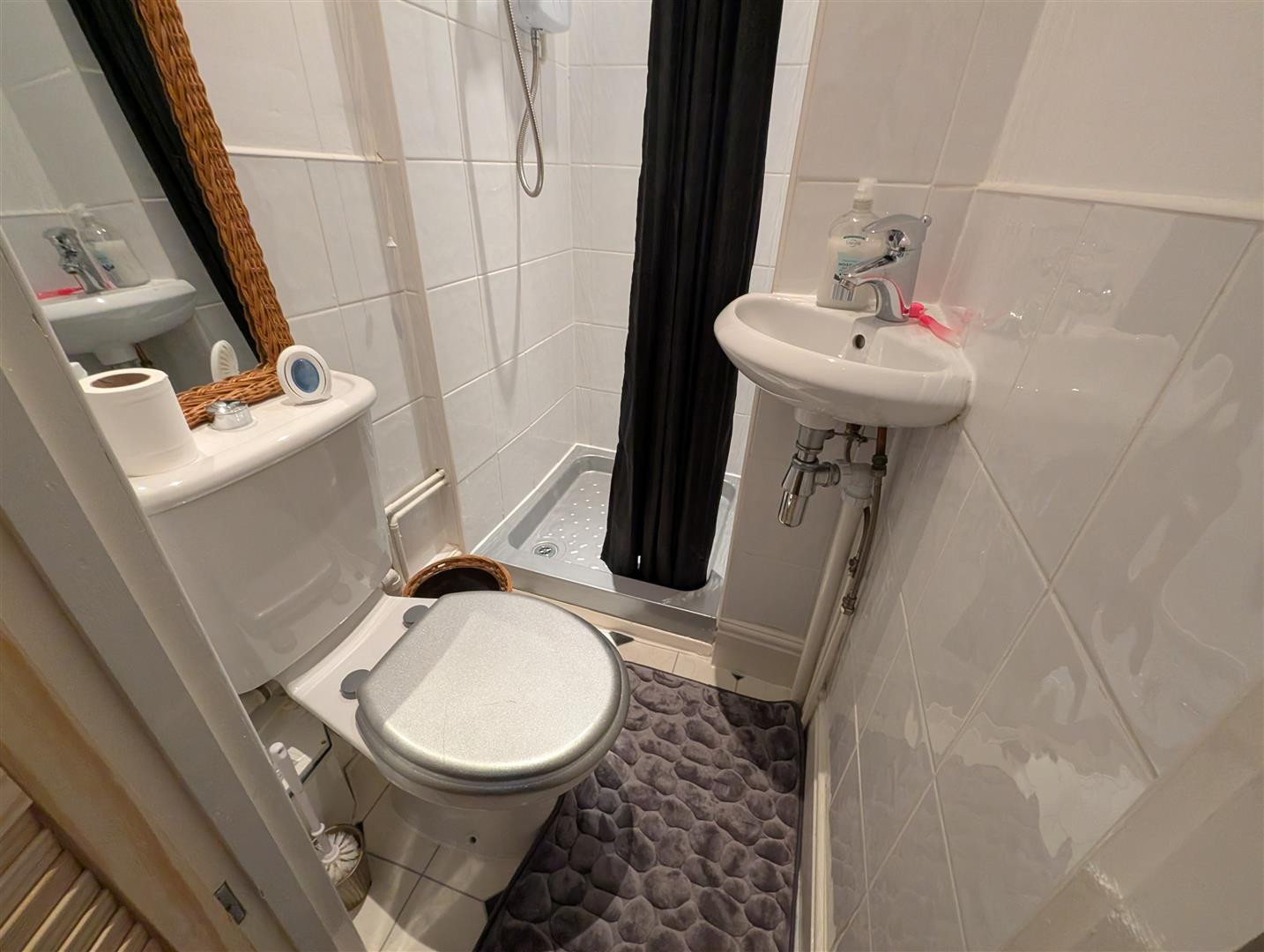 Shower within cubicle, wash hand basin and low level W,C.