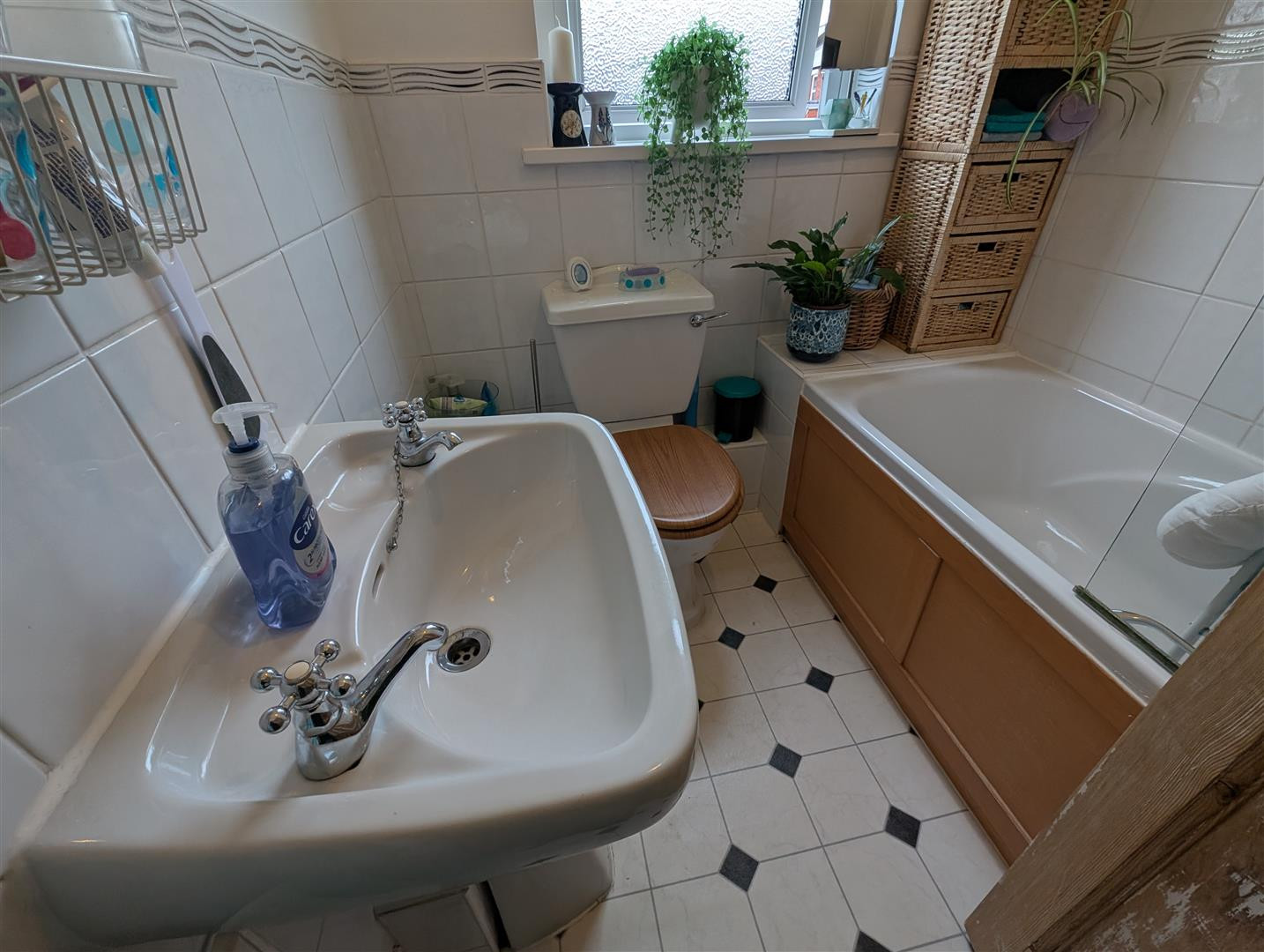 With a suite comprising panelled bath, pedestal wash hand basin and low level W,C.