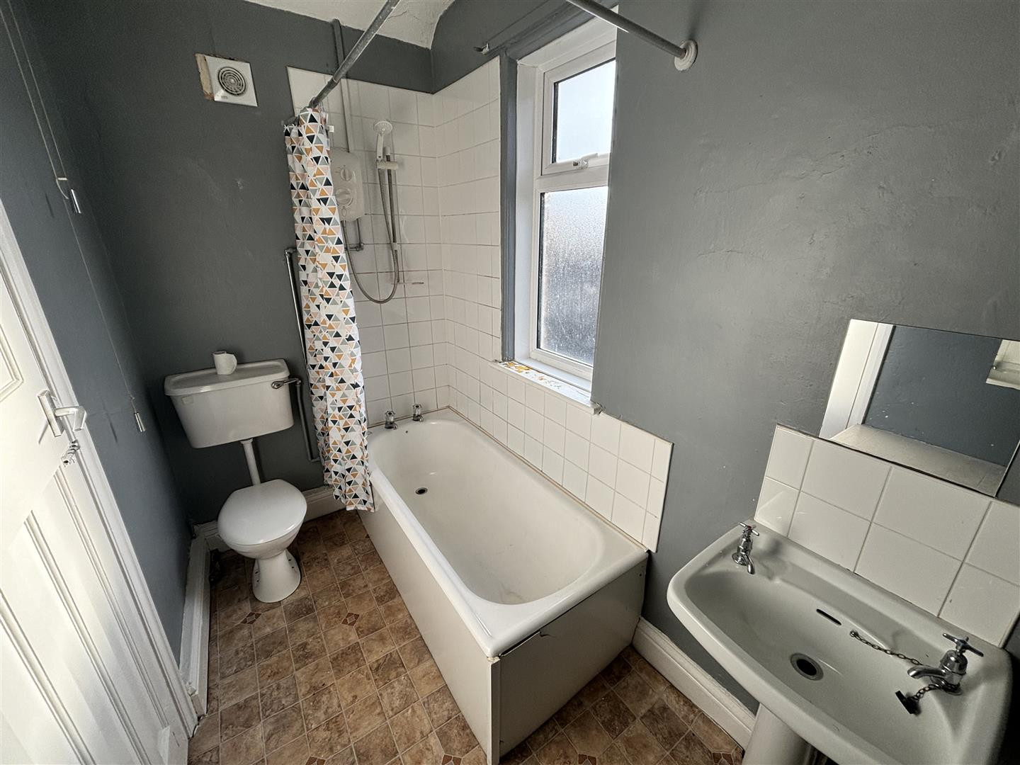 Comprising of a panelled bath with electric shower over, pedestal wash basin and WC. Having tiled splashbacks, radiator and UPVC double glazed opaque window to the rear.