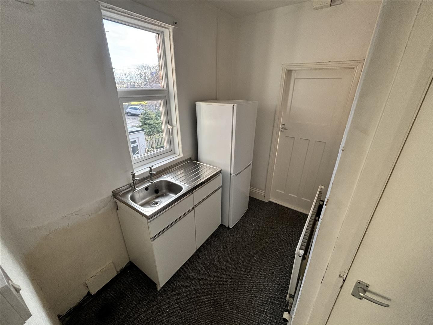 A useful room with fitted base units, a stainless steel sink and drainer unit, plumbing for a washing machine, fridge/freezer and UPVC double glazed window to the side. A door leads to stairs providing access to the rear parking.