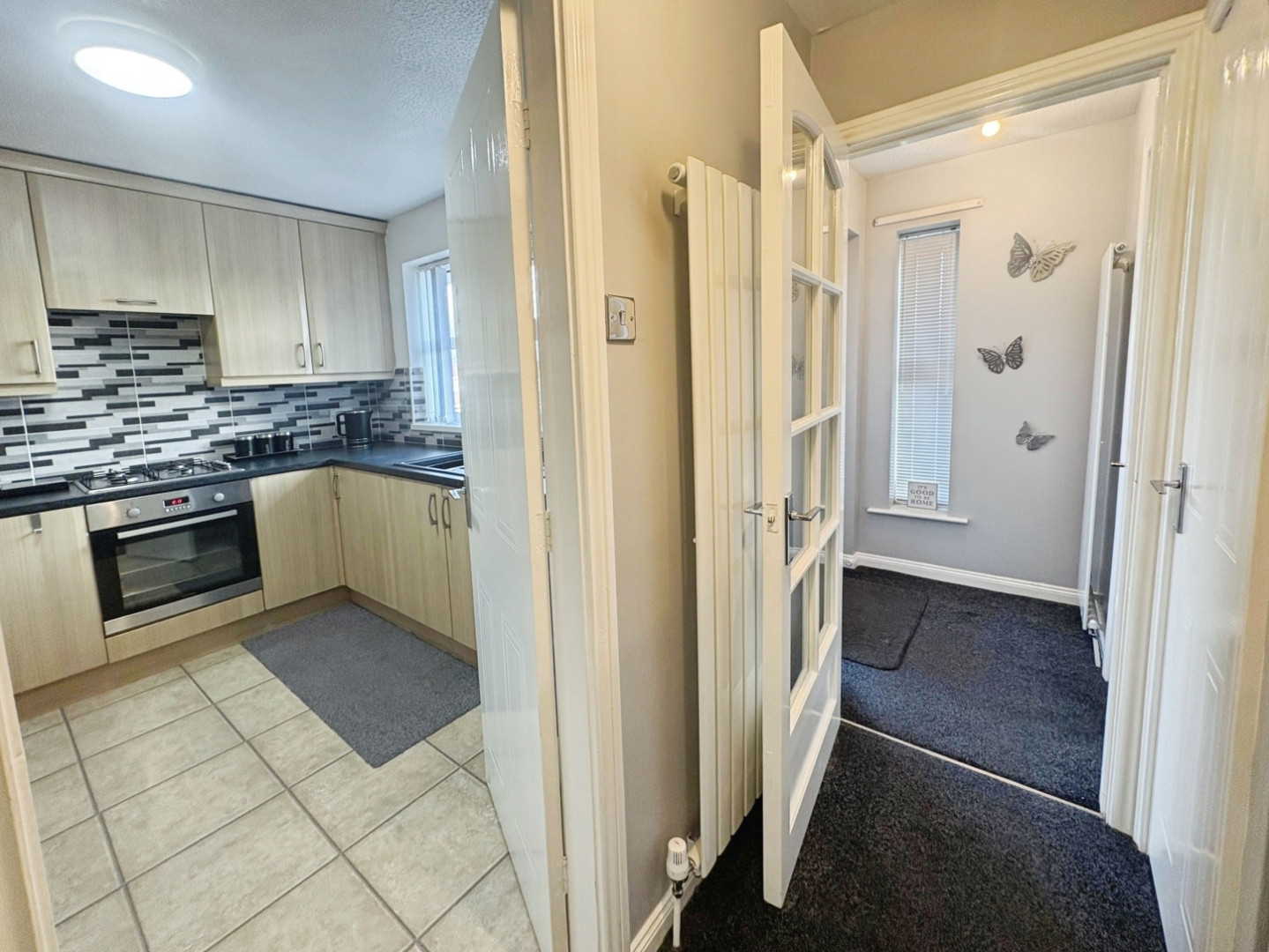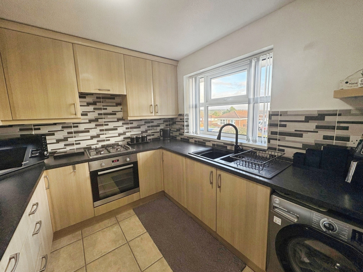 Fitted with a range of base and wall mounted storage units with laminate work surfaces over and tiled splash backs, black one and half bowl sink unit with mixer tap and integrated electric oven and gas hob. There is ample space for further free standing appliances as required, central heating radiator and UPVC window.