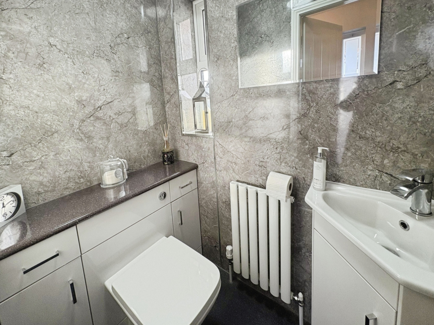 Fitted with corner wash had basin with vanity below, WC, obscured UPVC window, central heating radiator and modern wall cladding.