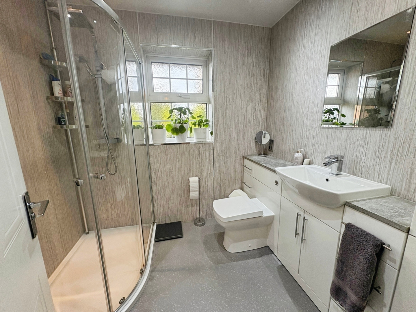 Fitted either a three piece suite comprising corner shower cubicle with power shower and separate handheld shower attachment, WC and wash hand basin built into a vanity storage cabinet, obscured UPVC window and chrome floor to ceiling central heating radiator.
