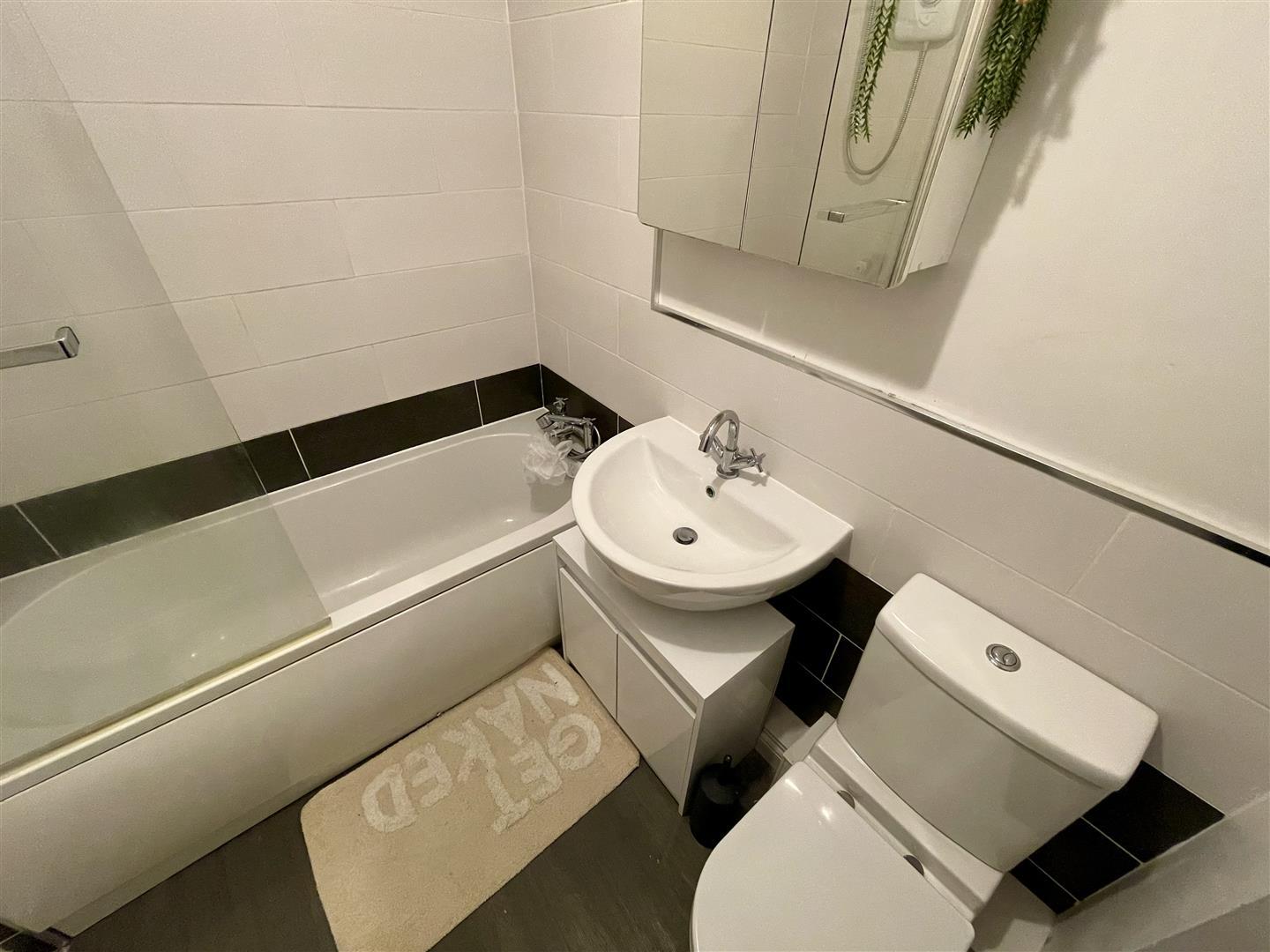 Panelled bath with shower over and screen, low level w.c and wall mounted wash hand basin with vanity under. Part tiled walls.