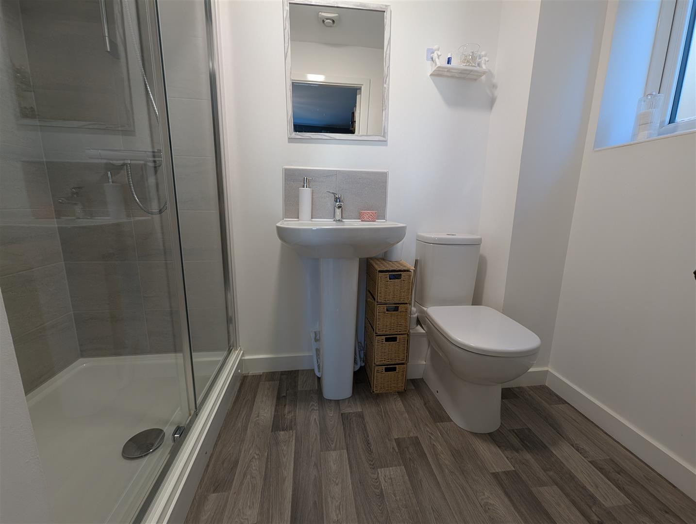 Upvc double glazed obscure window to rear, low level w.c and wash hand basin. Heated towel rail.