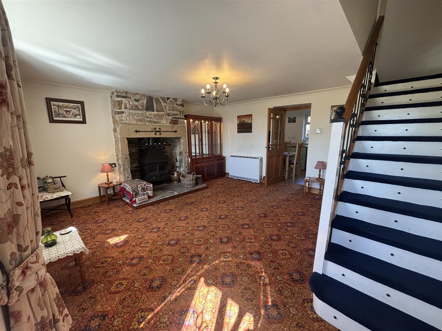 Wooden stairs lead to the first floor, UPVC bay window allowing views over the garden and far reaching countryside views beyond. A beautiful focal point to the room is a stone inglenook with a stone hearth housing a multi fuel stove, electric storage heater and a door leading into the breakfast kitchen.