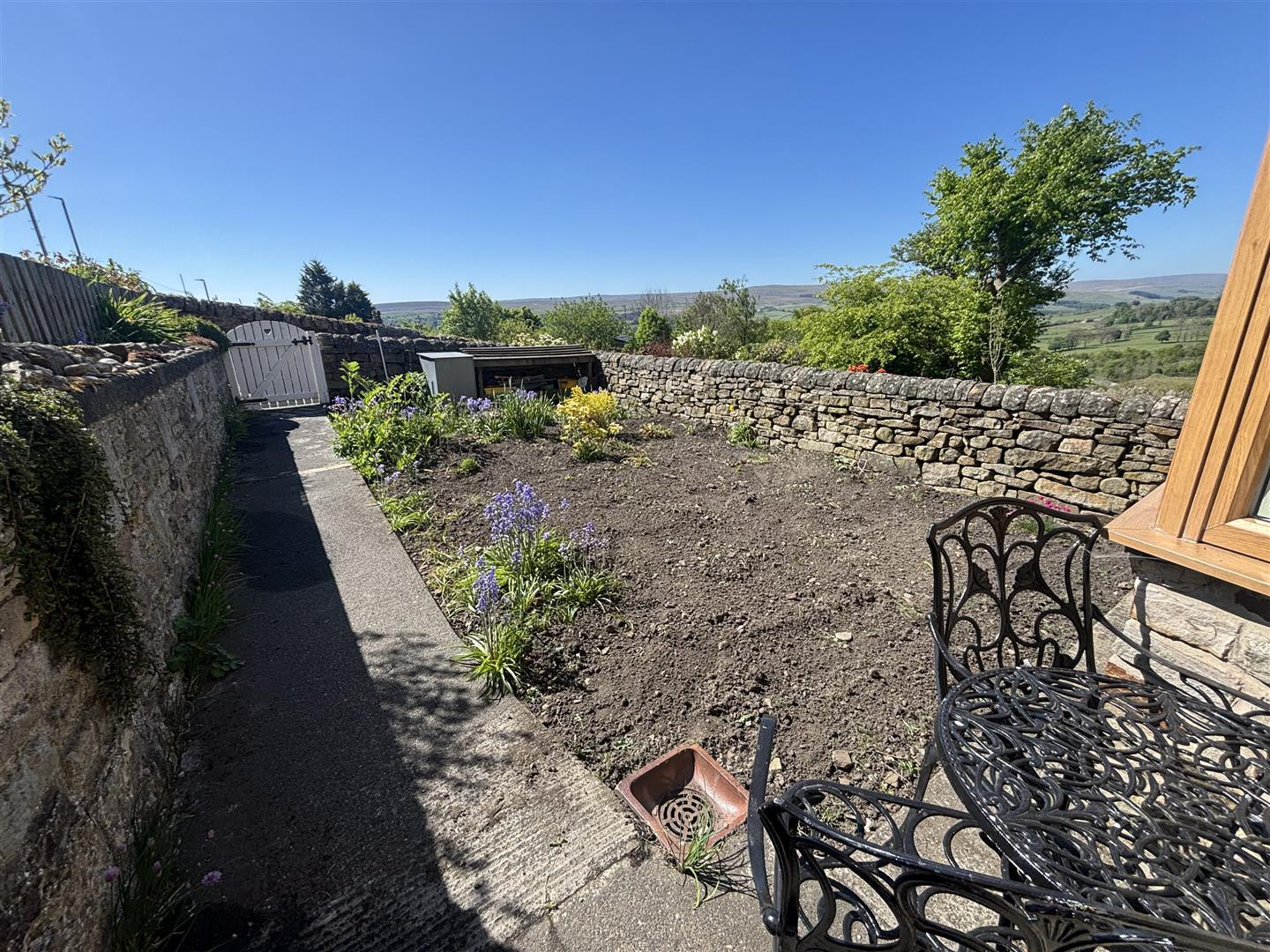 To the front of the property there is an enclosed garden area bounded by fencing and stone walls. Stone pathway to the front door.
